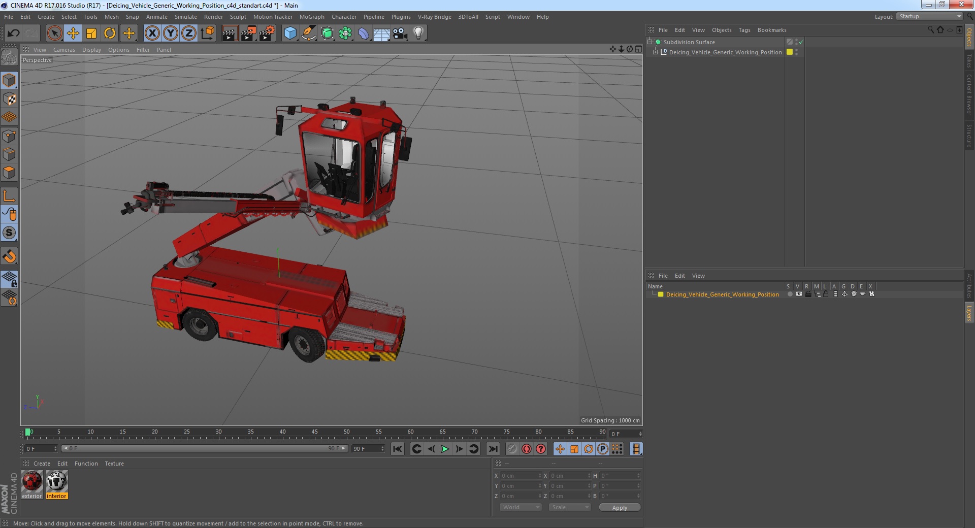 Deicing Vehicle Generic Working Position is a high quality, photo real 3d model that will enhance detail and realism to any of your rendering projects. The model has a fully textured, detailed design that allows for close-up renders, and was originally modeled in 3ds Max 2020 and rendered with V-Ray. Renders have no postprocessing!
