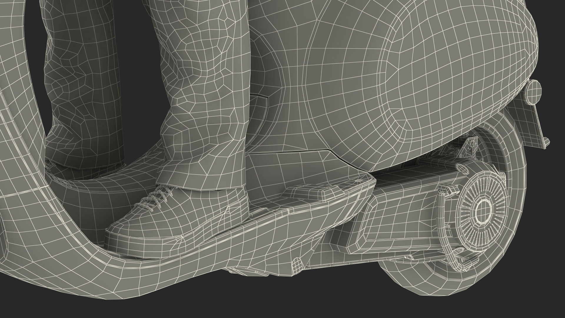 Delivery Man Riding Scooter is a three-dimensional model of a young male courier with motor scooter vehicle, protective hard hat, commercial service costume and backpack container.