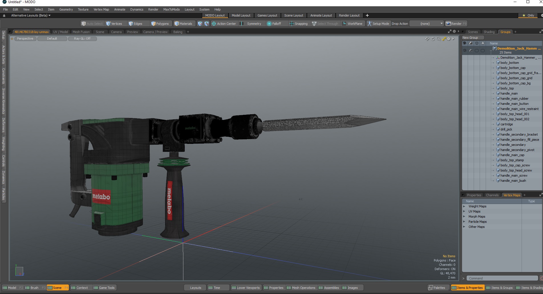 Demolition Jack Hammer Metabo is a high quality, photo real 3d model that will enhance detail and realism to any of your rendering projects. The model has a fully textured, detailed design that allows for close-up renders, and was originally modeled in 3ds Max 2020 and rendered with V-Ray. Renders have no postprocessing!