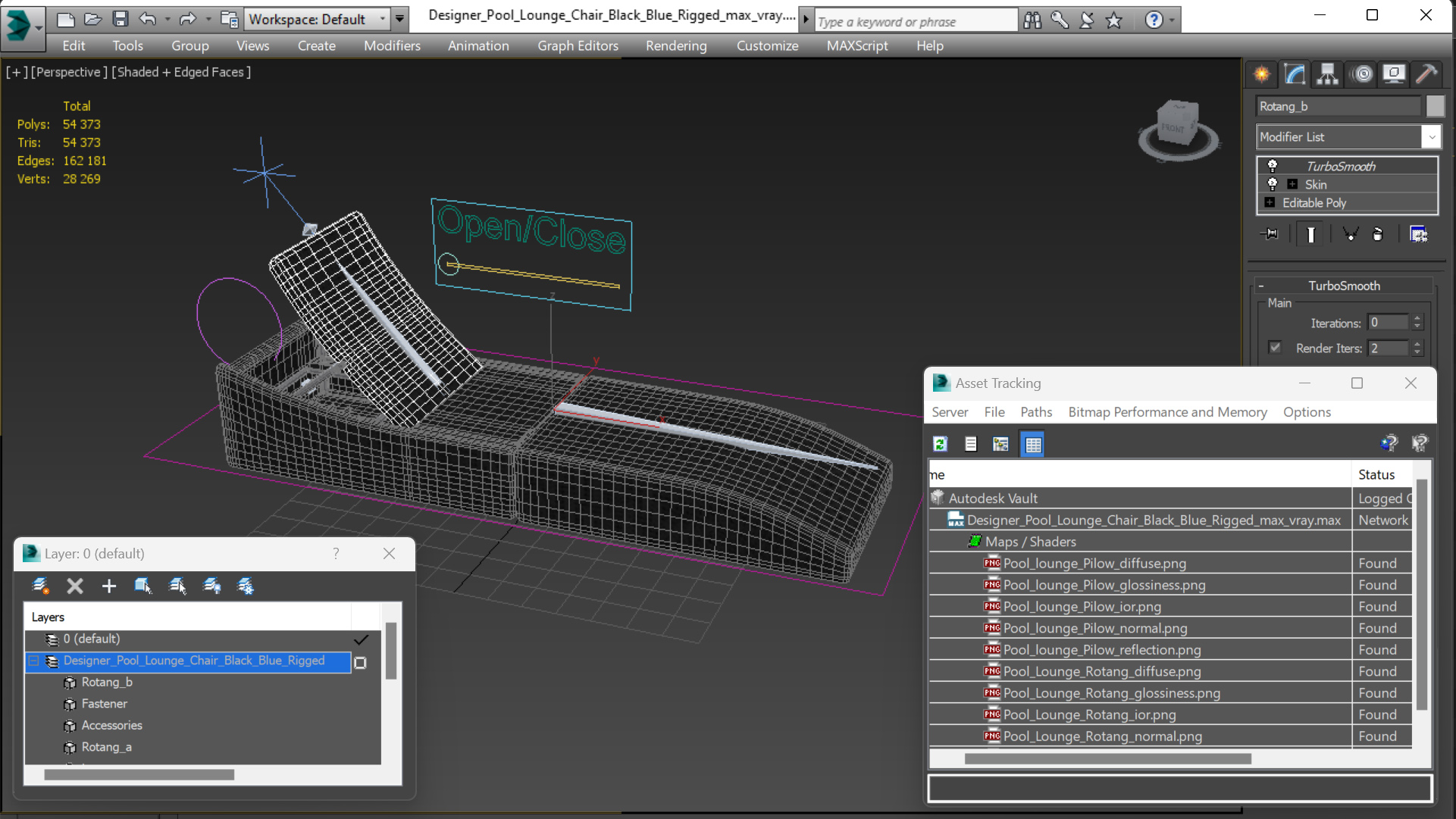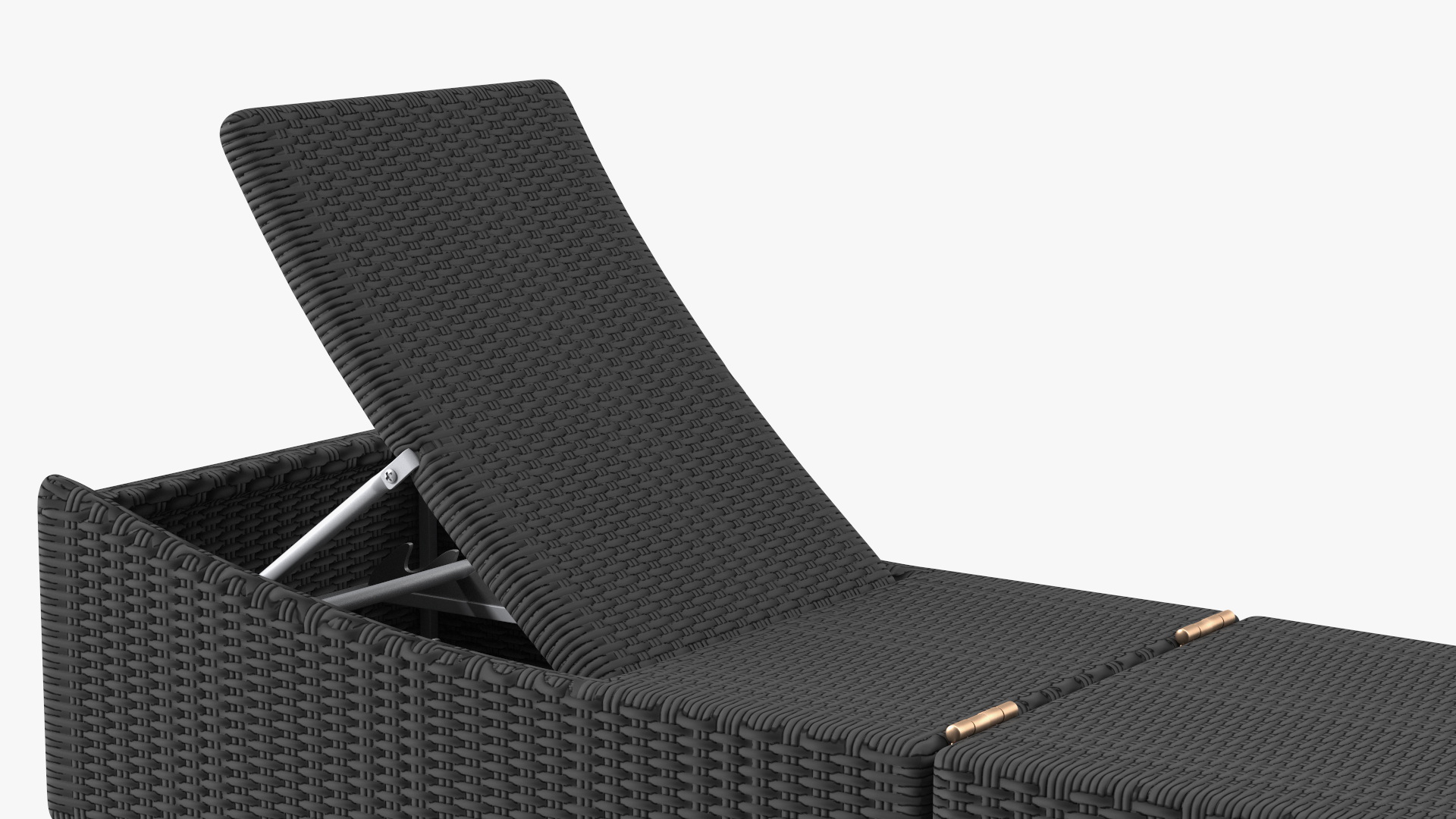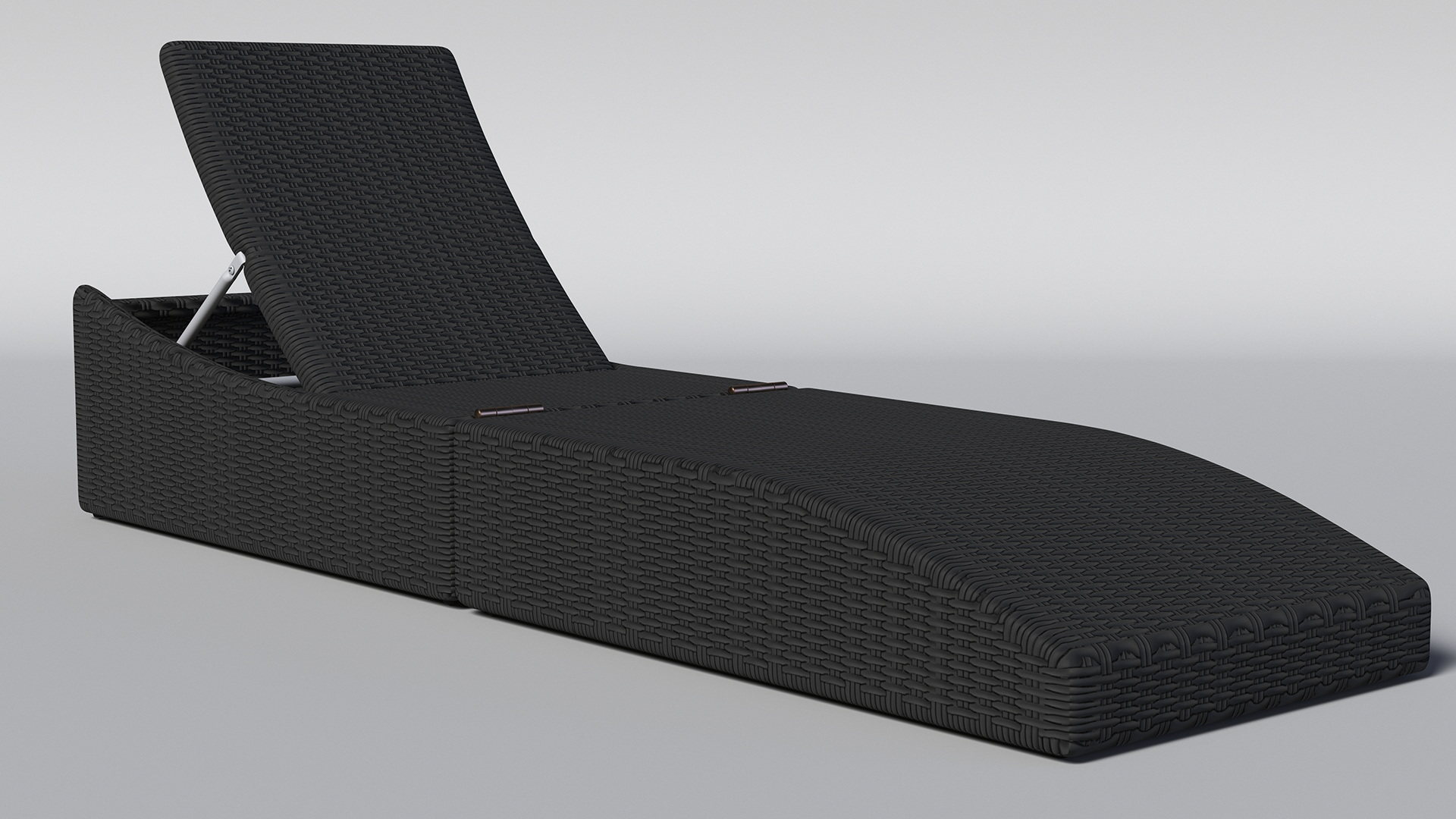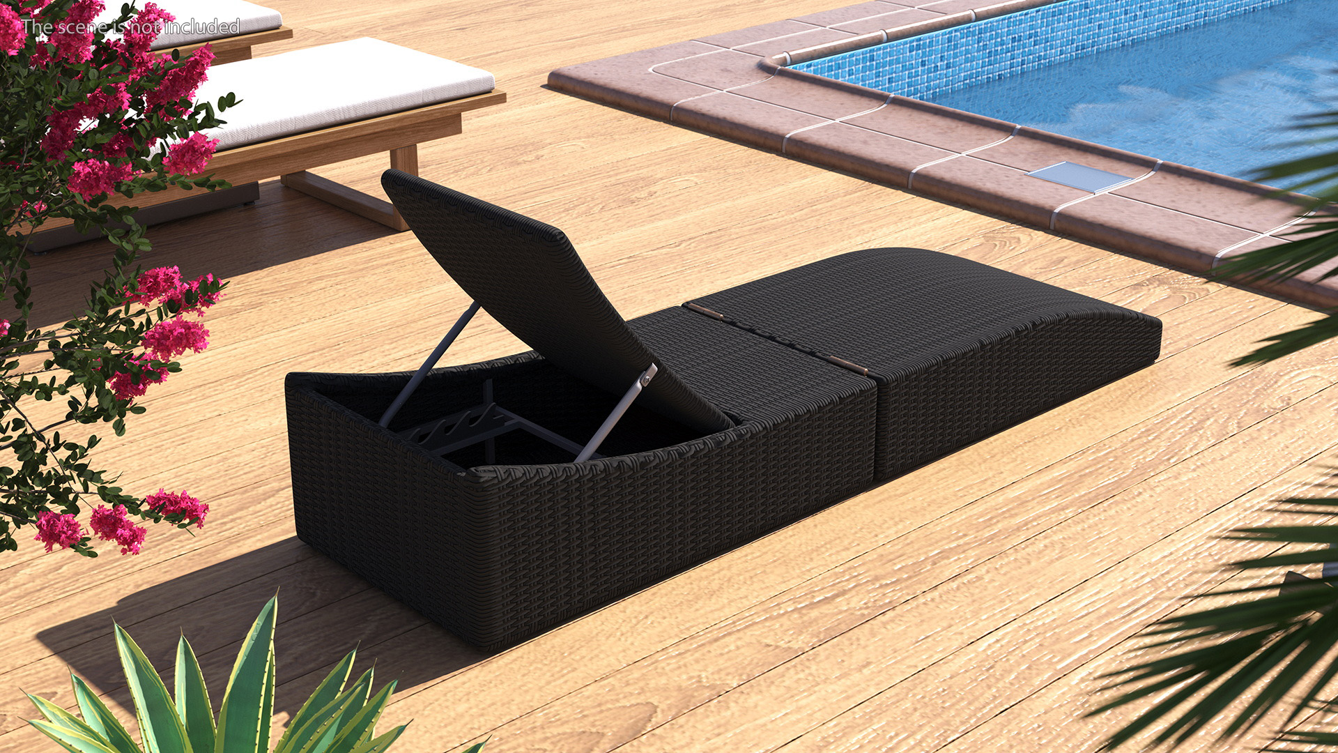 Designer Pool Lounge Chair Black Blue Rigged is a three-dimensional model of folding pool lounge chair which is a specimen of furniture designed for relaxation on the beach or next to the pool.