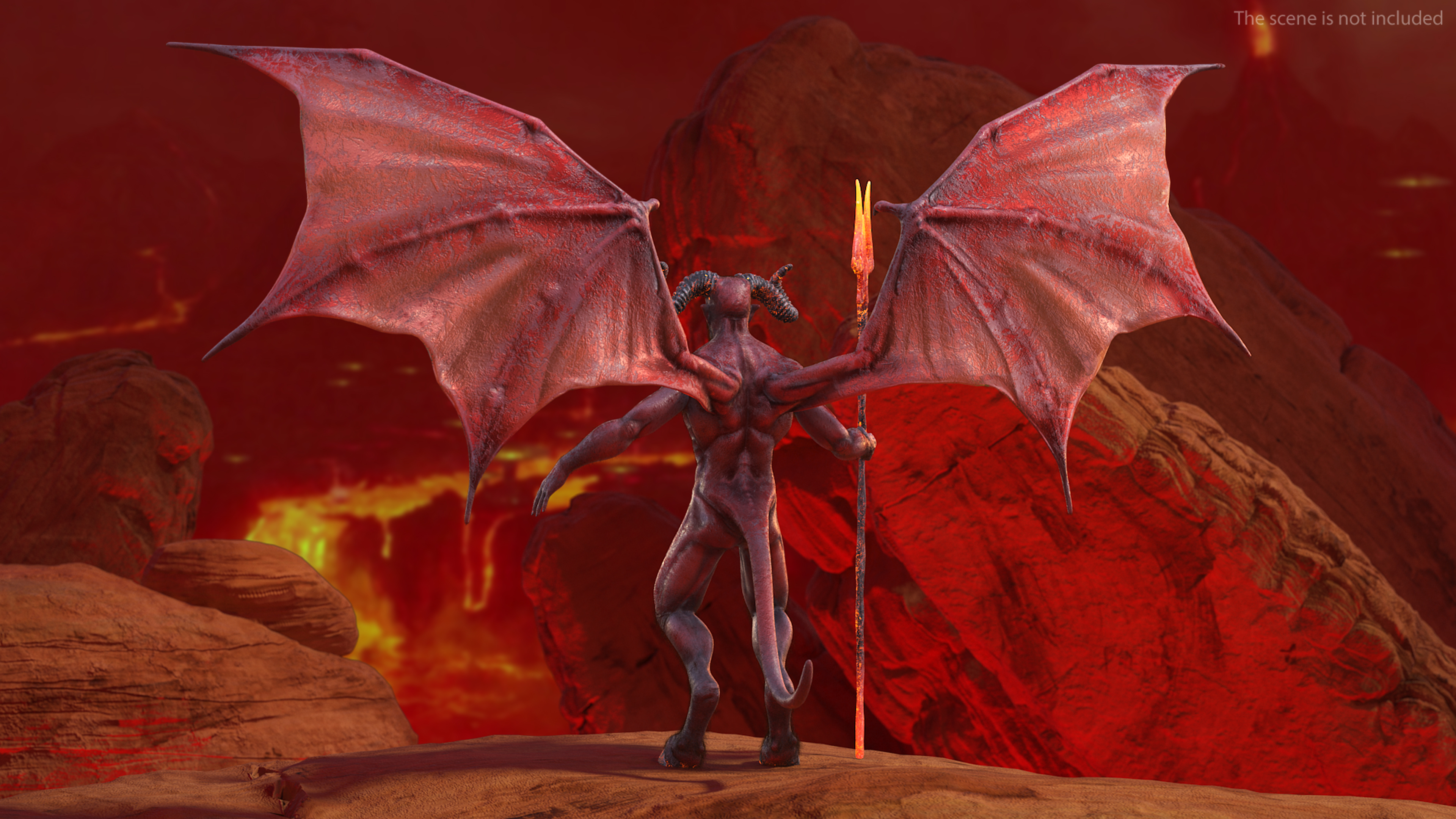 Fiction imaginary and scary creature with red bloody skin, a modern video games character designed for fantasy video games and fiction computer games playing. Scary human-like popular creature with strange large hands, strong body, having wings on his back and horns on head, holding trident in hands as symbol of power.
