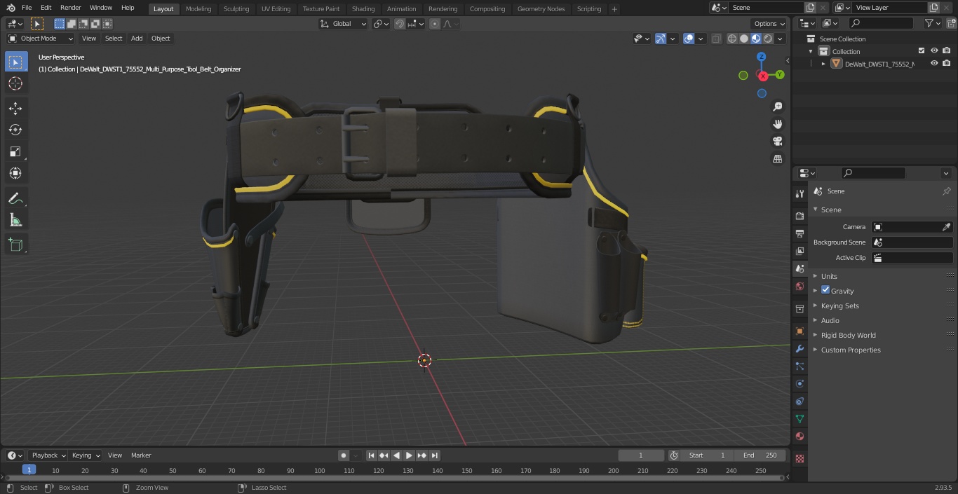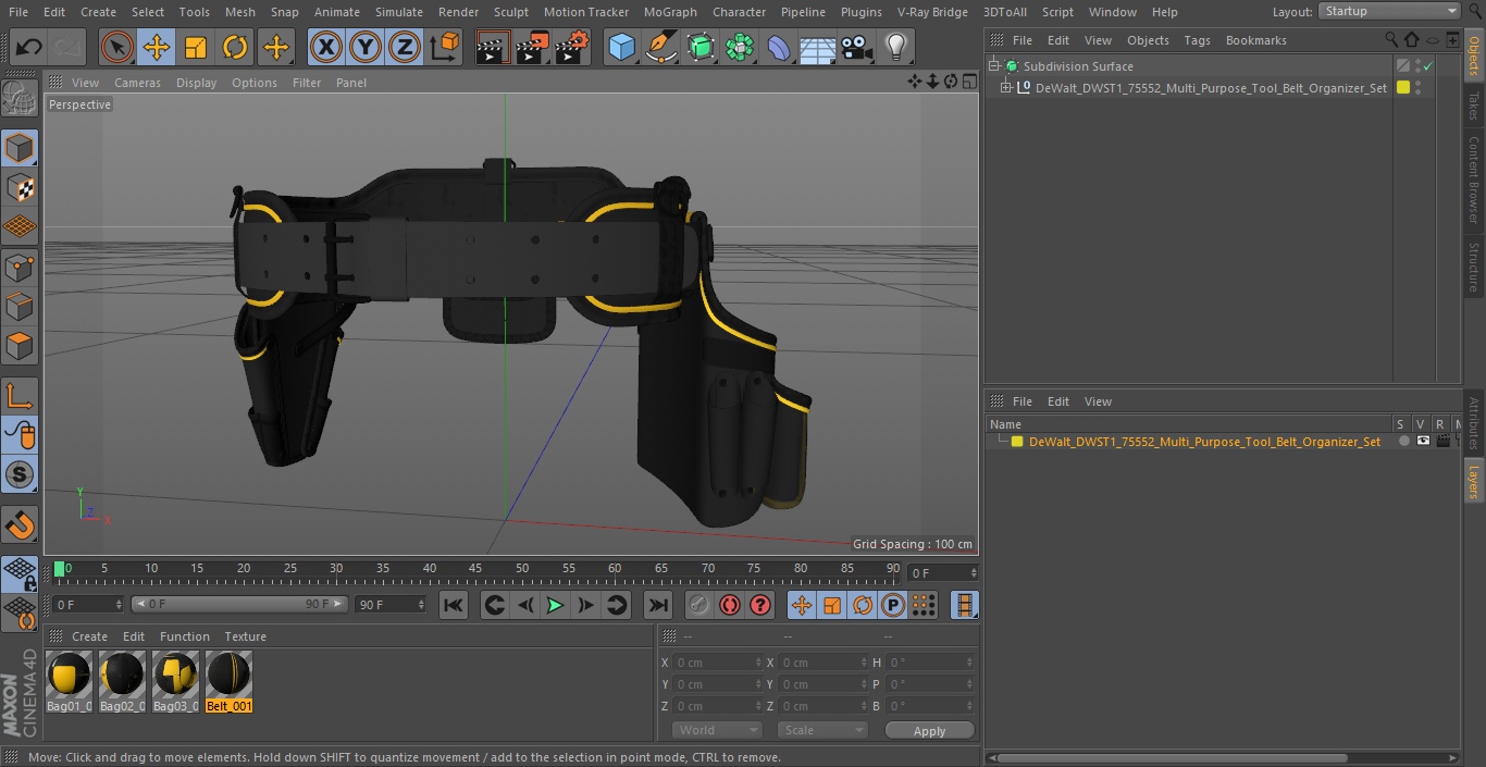 DeWalt DWST1 75552 Multi Purpose Tool Belt Organizer Set is a high quality, photo real 3d model that will enhance detail and realism to any of your rendering projects. The model has a fully textured, detailed design that allows for close-up renders, and was originally modeled in 3ds Max 2020 and rendered with V-Ray. Renders have no postprocessing!