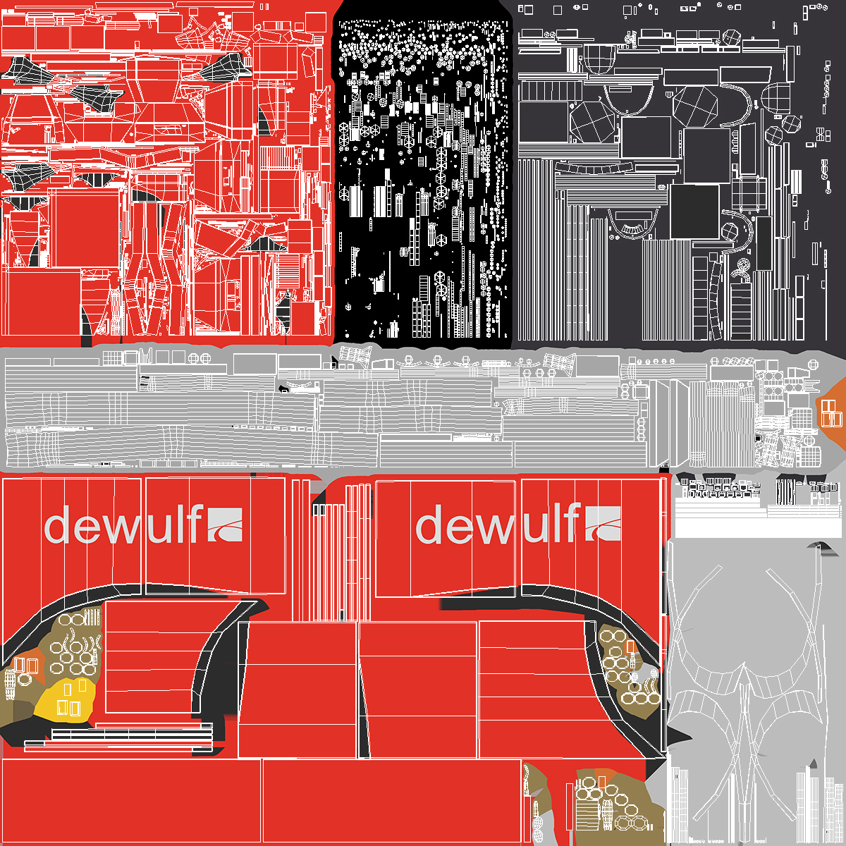 All textures and materials are included and mapped. (All colors can be easily modified.)