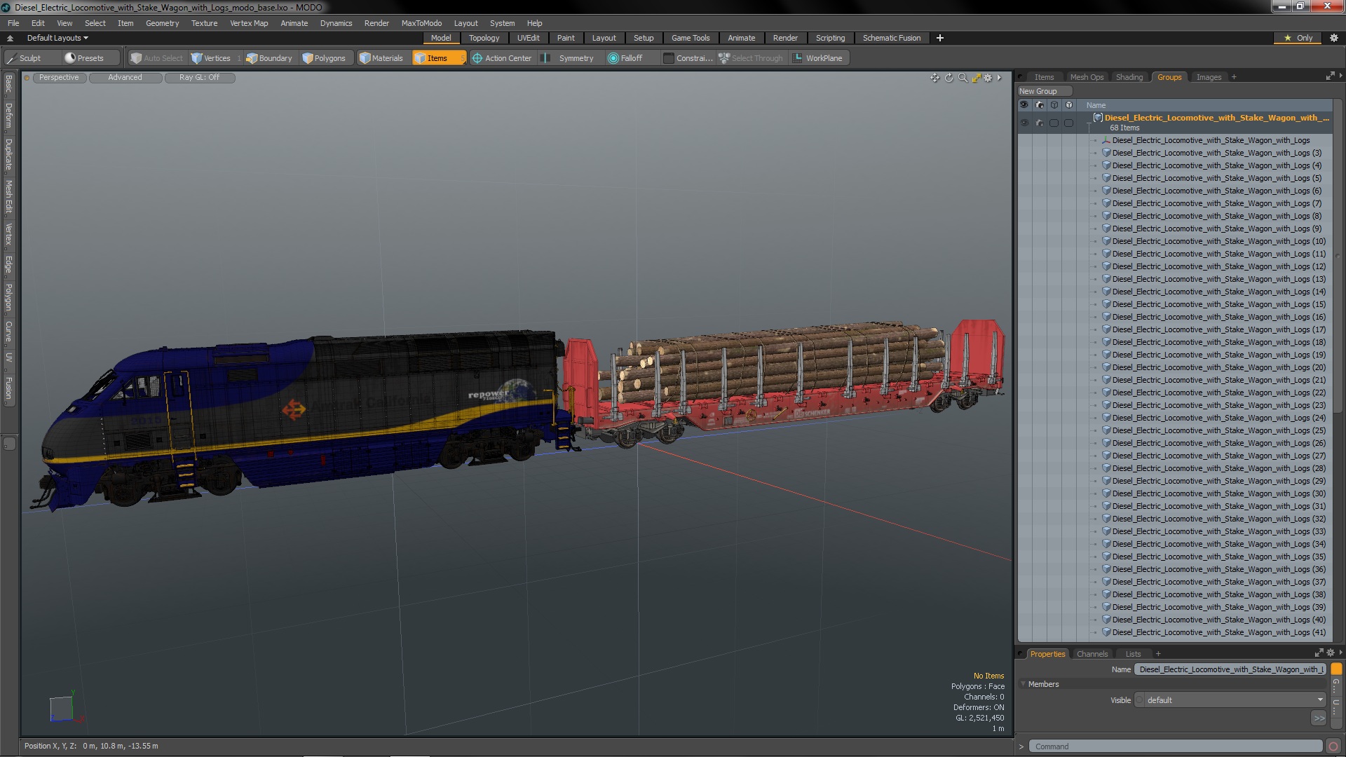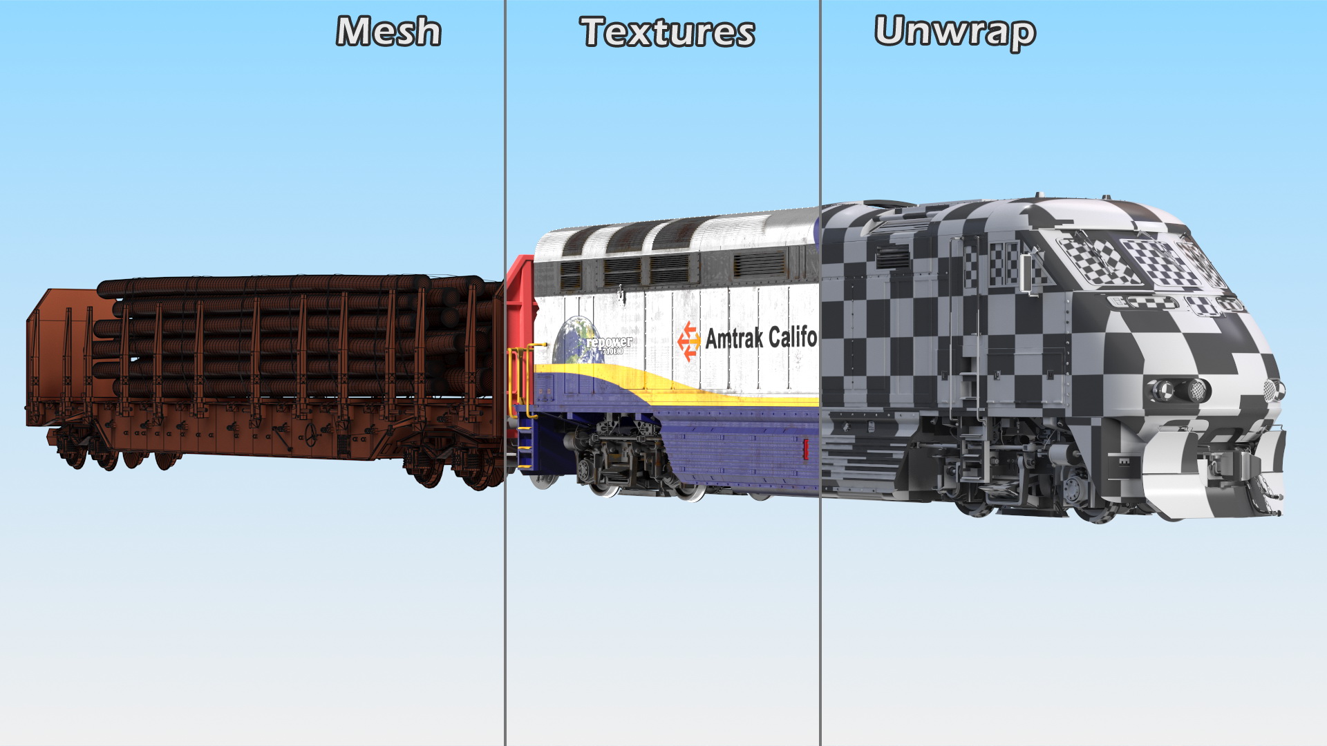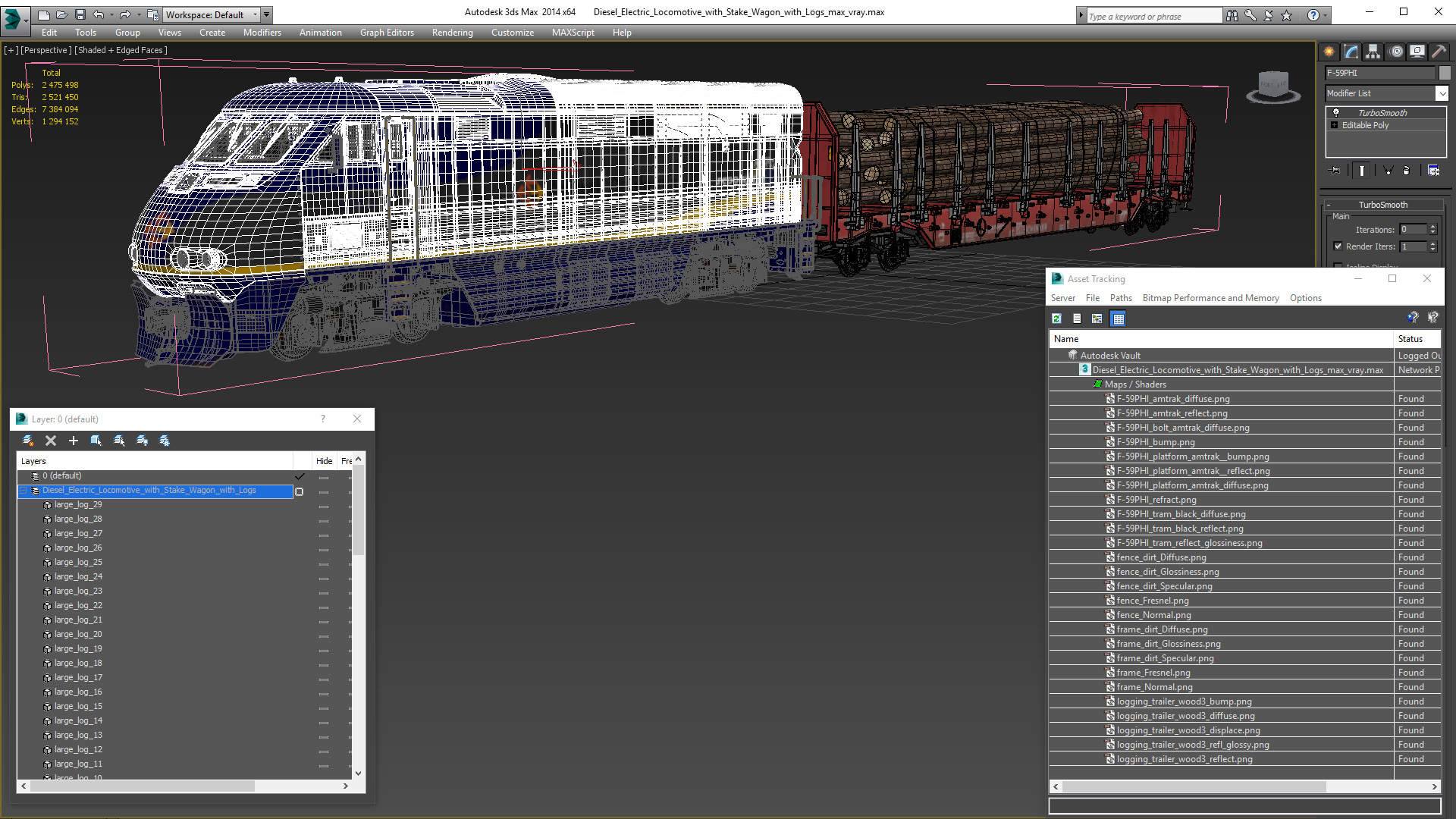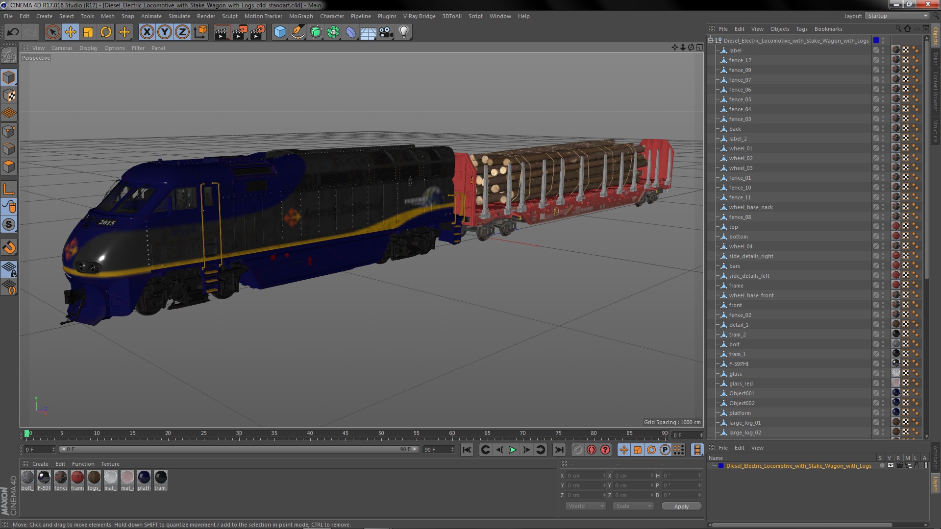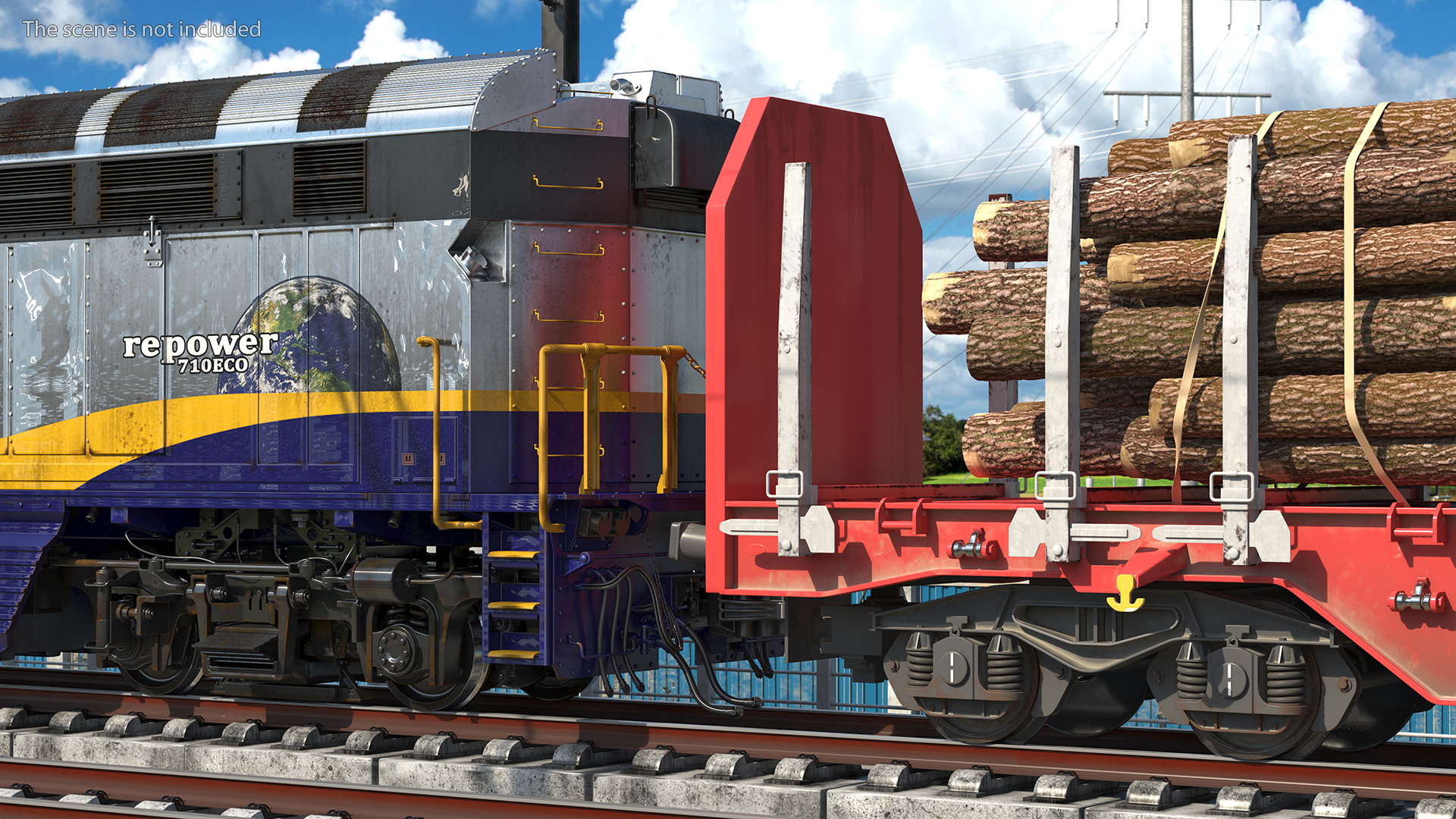 Diesel Electric Locomotive with Stake Wagon with Logs is a high quality, photo real 3d model that will enhance detail and realism to any of your rendering projects. The model has a fully textured, detailed design that allows for close-up renders, and was originally modeled in 3ds Max 2020 and rendered with V-Ray. Renders have no postprocessing!