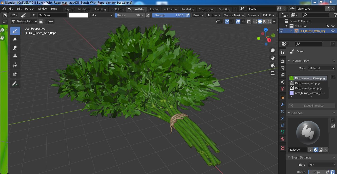 Dill Bunch With Rope is a high quality, photo real 3d model that will enhance detail and realism to any of your rendering projects. The model has a fully textured, detailed design that allows for close-up renders, and was originally modeled in 3ds Max 2020 and rendered with V-Ray. Renders have no postprocessing!