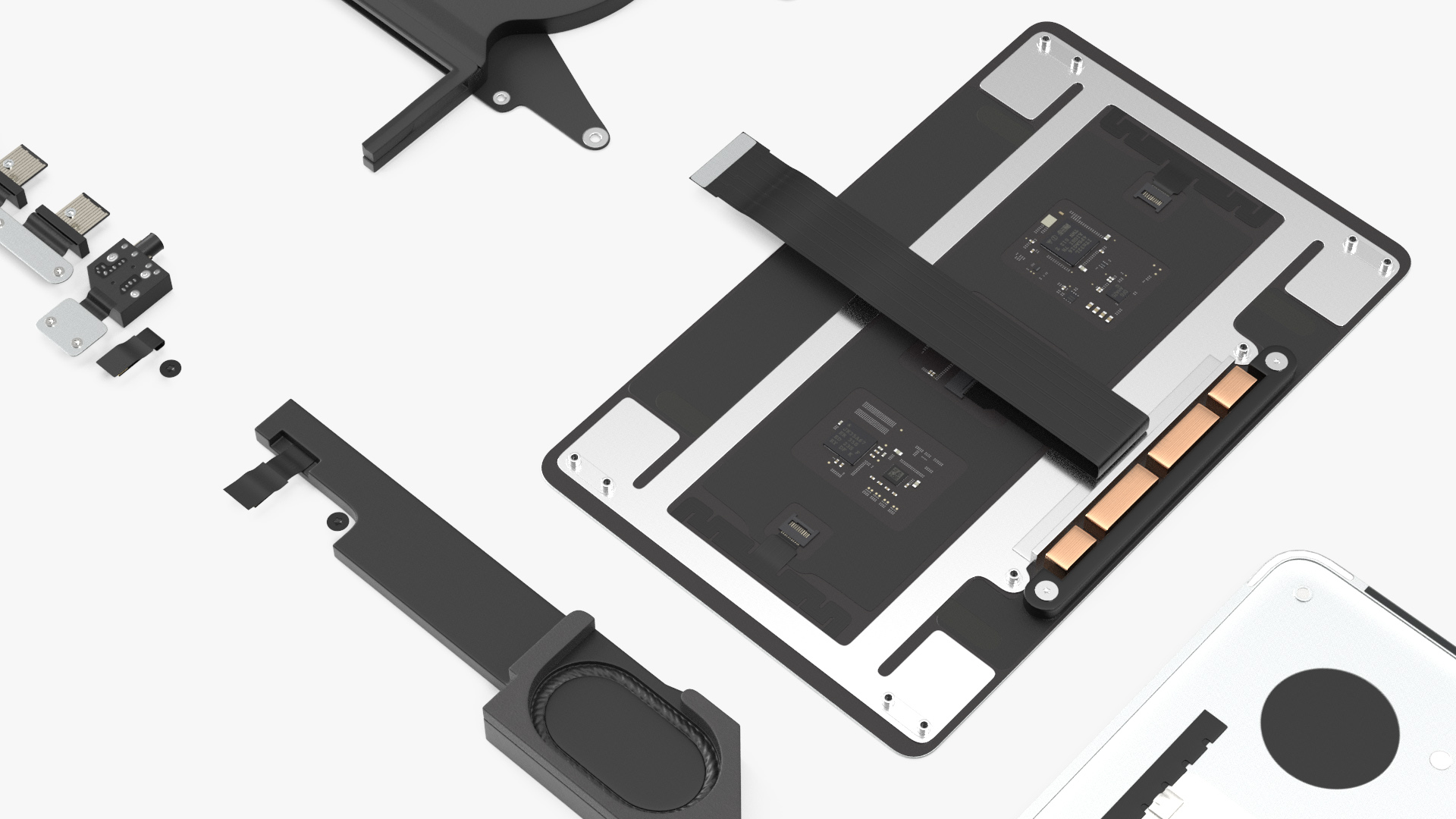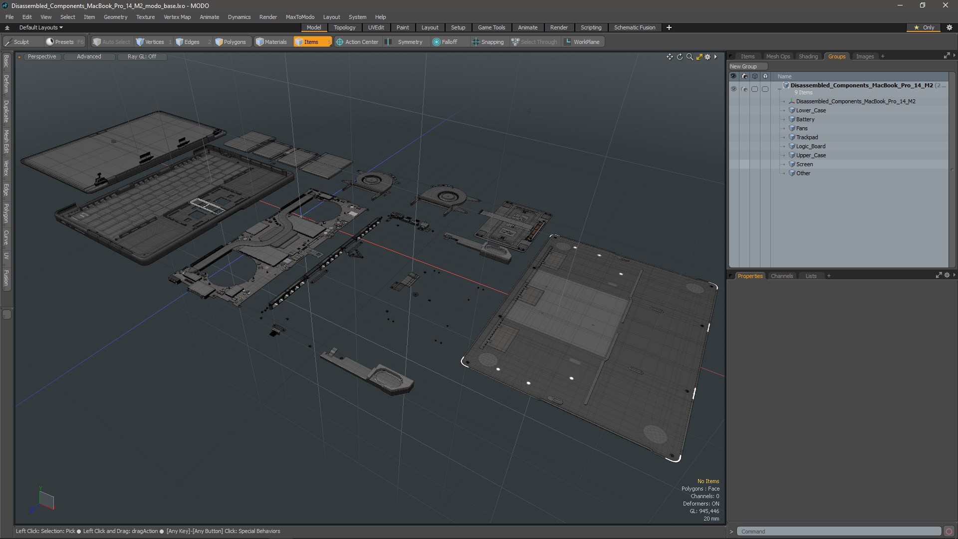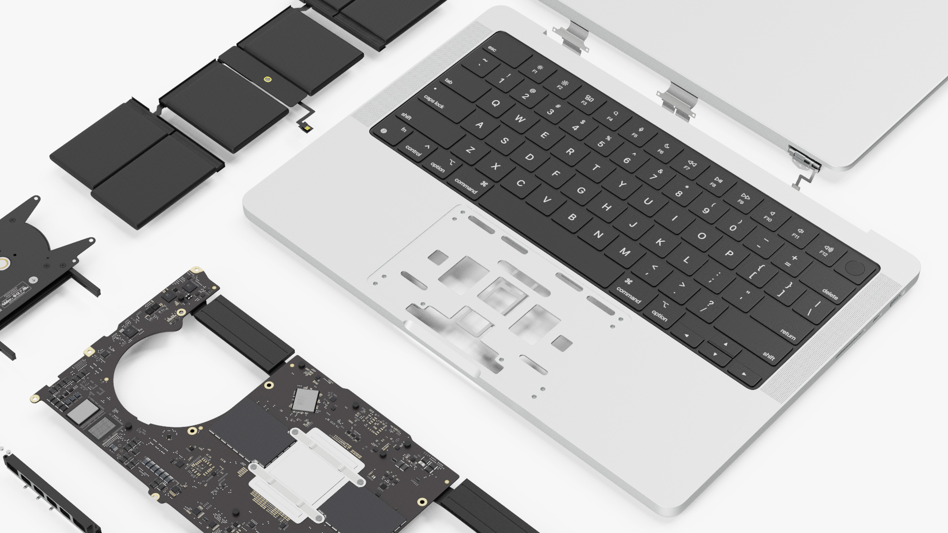 Disassembled Components MacBook Pro 14 M2 is a 3d model of parts and components that make up the MacBook Pro 14 laptop computer.