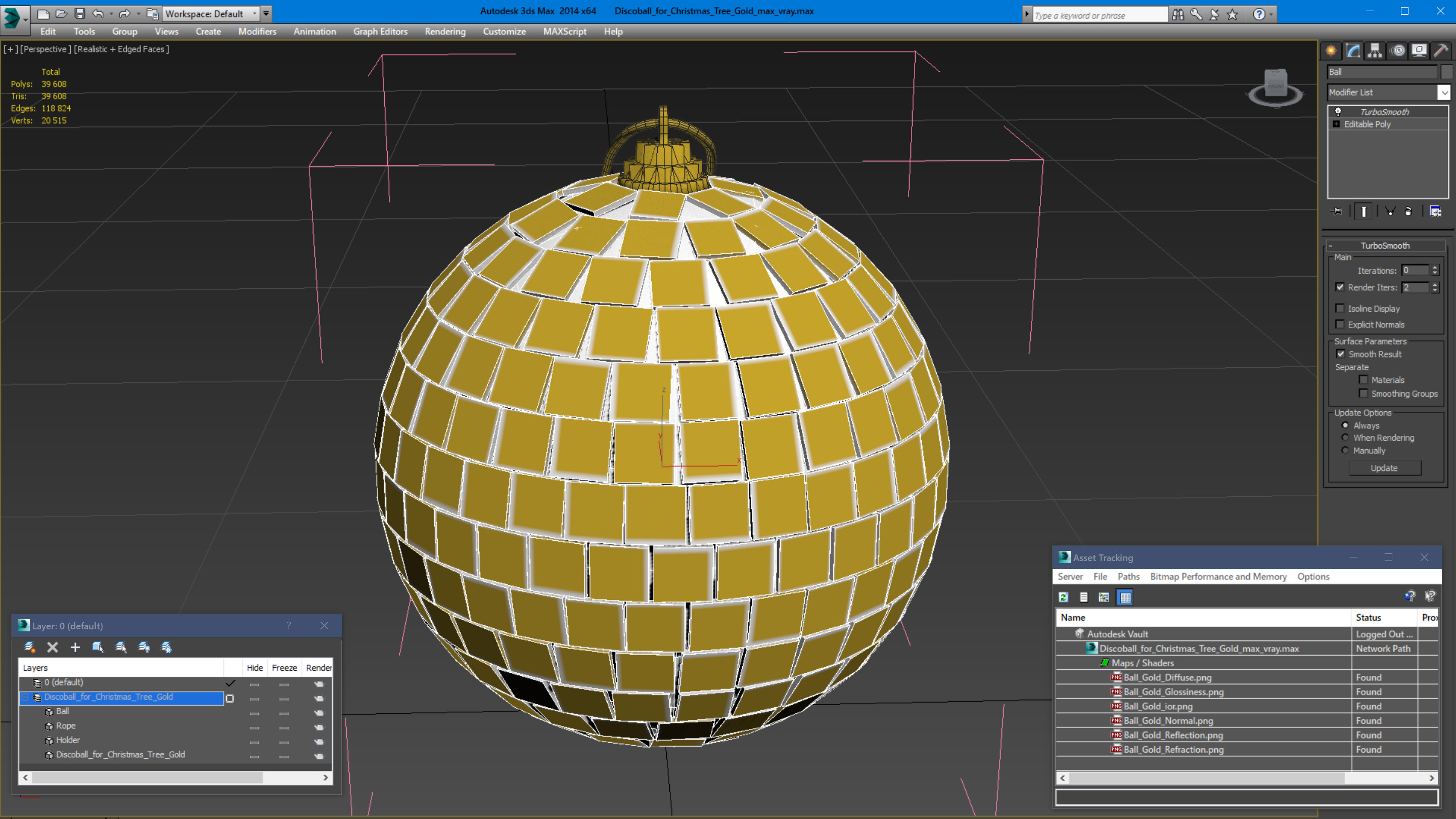 Discoball for Christmas Tree Gold is a high quality, photo real 3d model that will enhance detail and realism to any of your rendering projects. The model has a fully textured, detailed design that allows for close-up renders, and was originally modeled in 3ds Max 2020 and rendered with V-Ray. Renders have no postprocessing!