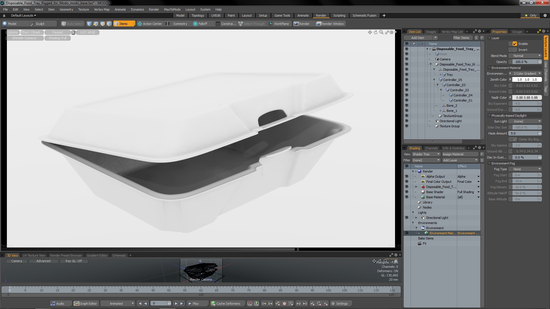 Disposable Food Tray Rigged for Modo is fully rigged and is ready to be animated. You can easily position it the way you need or animate it the way your project requires using helpers in 3D Studio Max. See the turntable to get an idea of how rigging works.