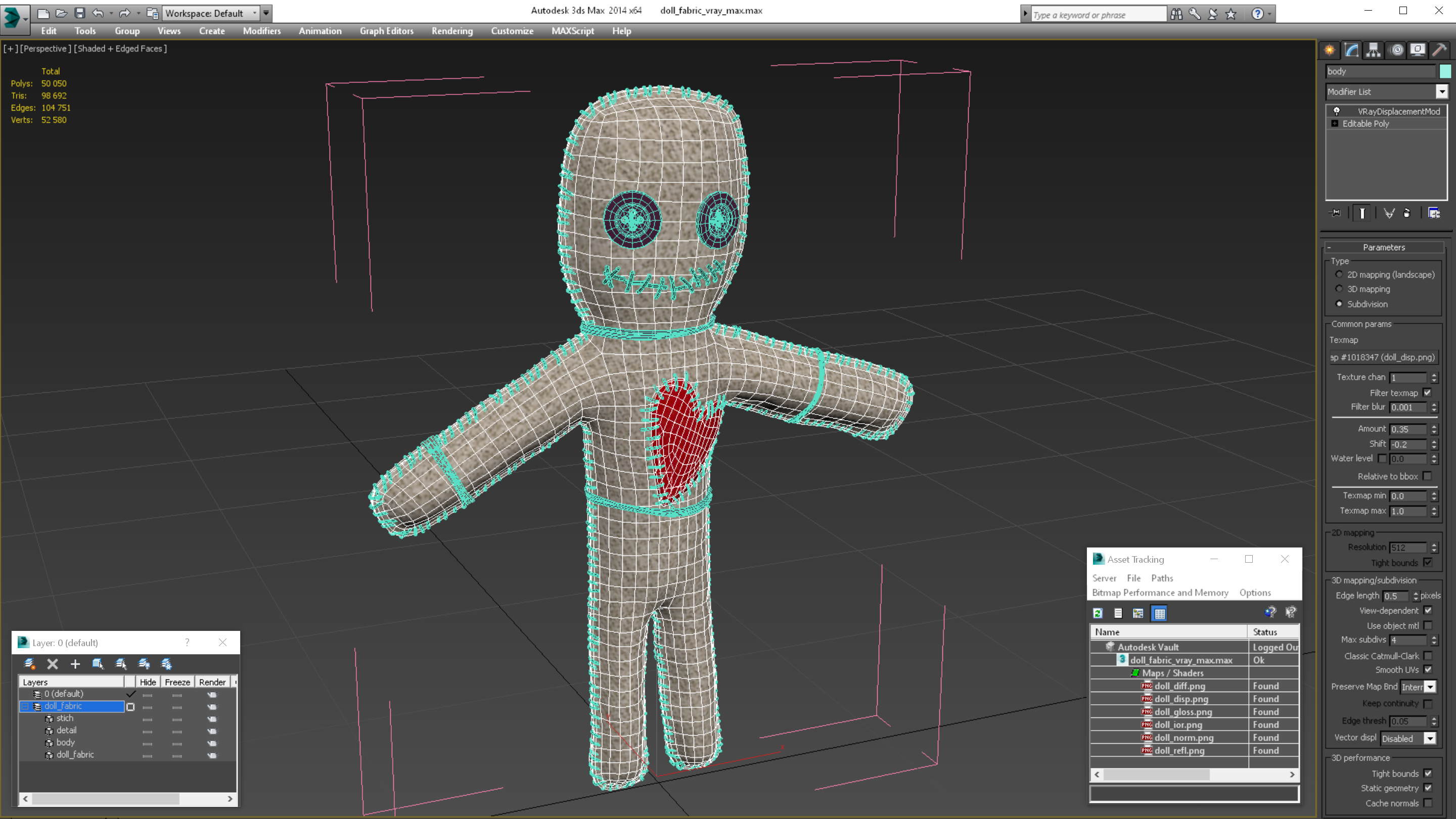 Doll Fabric is a high quality, photo real 3d model that will enhance detail and realism to any of your rendering projects. The model has a fully textured, detailed design that allows for close-up renders, and was originally modeled in 3ds Max 2020 and rendered with V-Ray. Renders have no postprocessing!