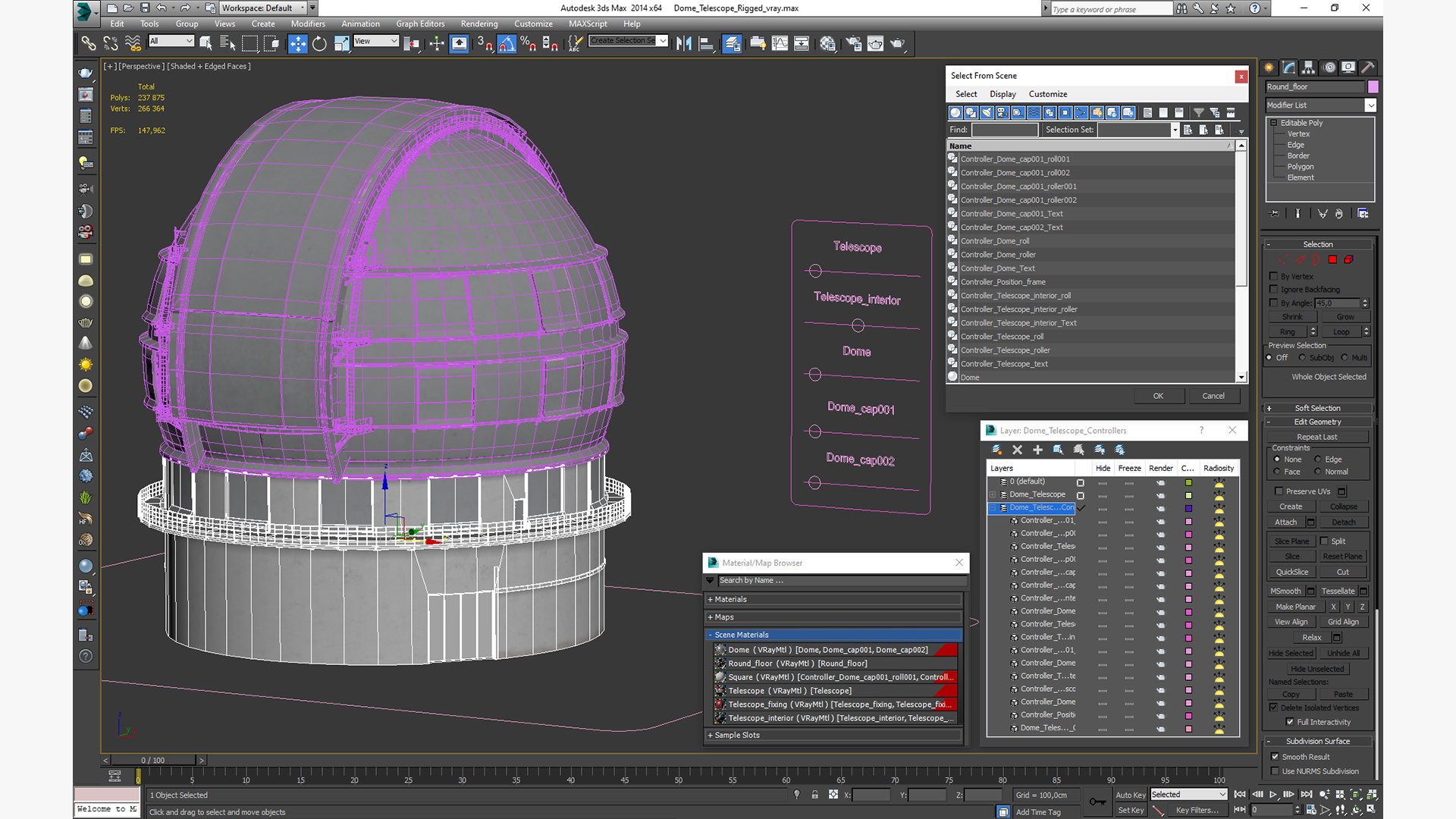 Dome Telescope Rigged is fully rigged and is ready to be animated. You can easily position it the way you need or animate it the way your project requires using helpers in 3D Studio Max. See the turntable to get an idea of how rigging works.