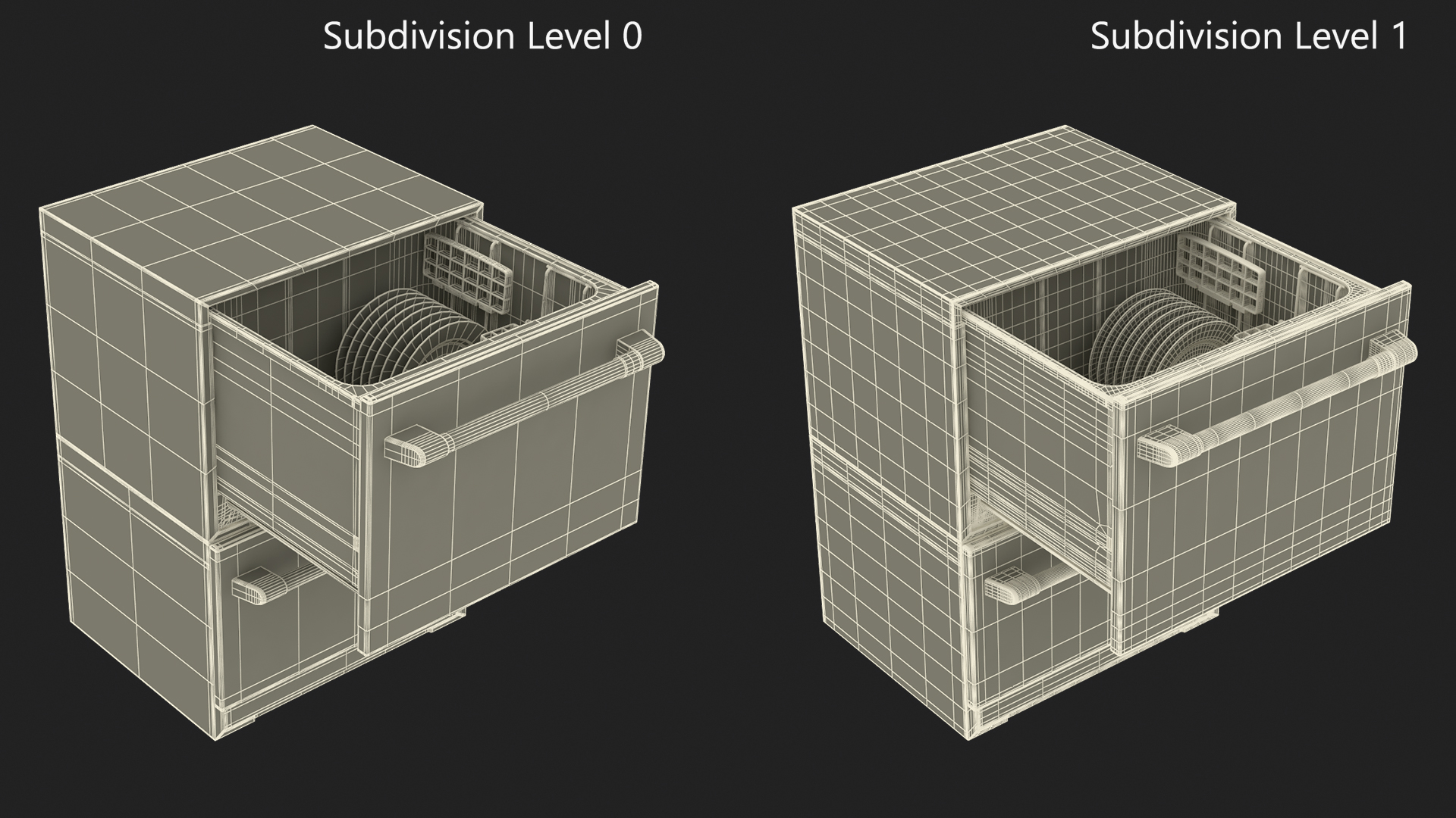 Double Drawer Dishwasher with Dishes is a three-dimensional model of a modern kitchen appliance designed to provide flexible and efficient dishwashing capabilities in a compact form.