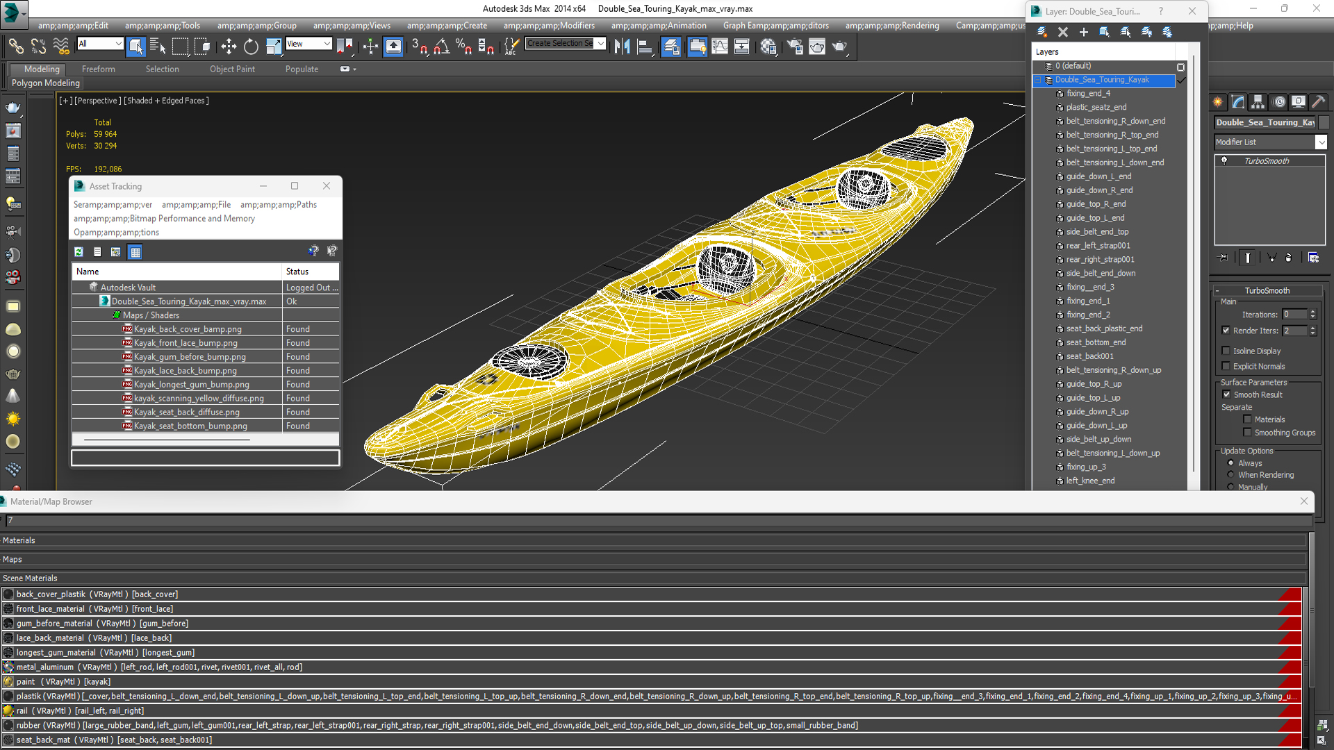 Double Sea Touring Kayak is a high quality, photo real 3d model that will enhance detail and realism to any of your rendering projects. The model has a fully textured, detailed design that allows for close-up renders, and was originally modeled in 3ds Max 2020 and rendered with V-Ray. Renders have no postprocessing!