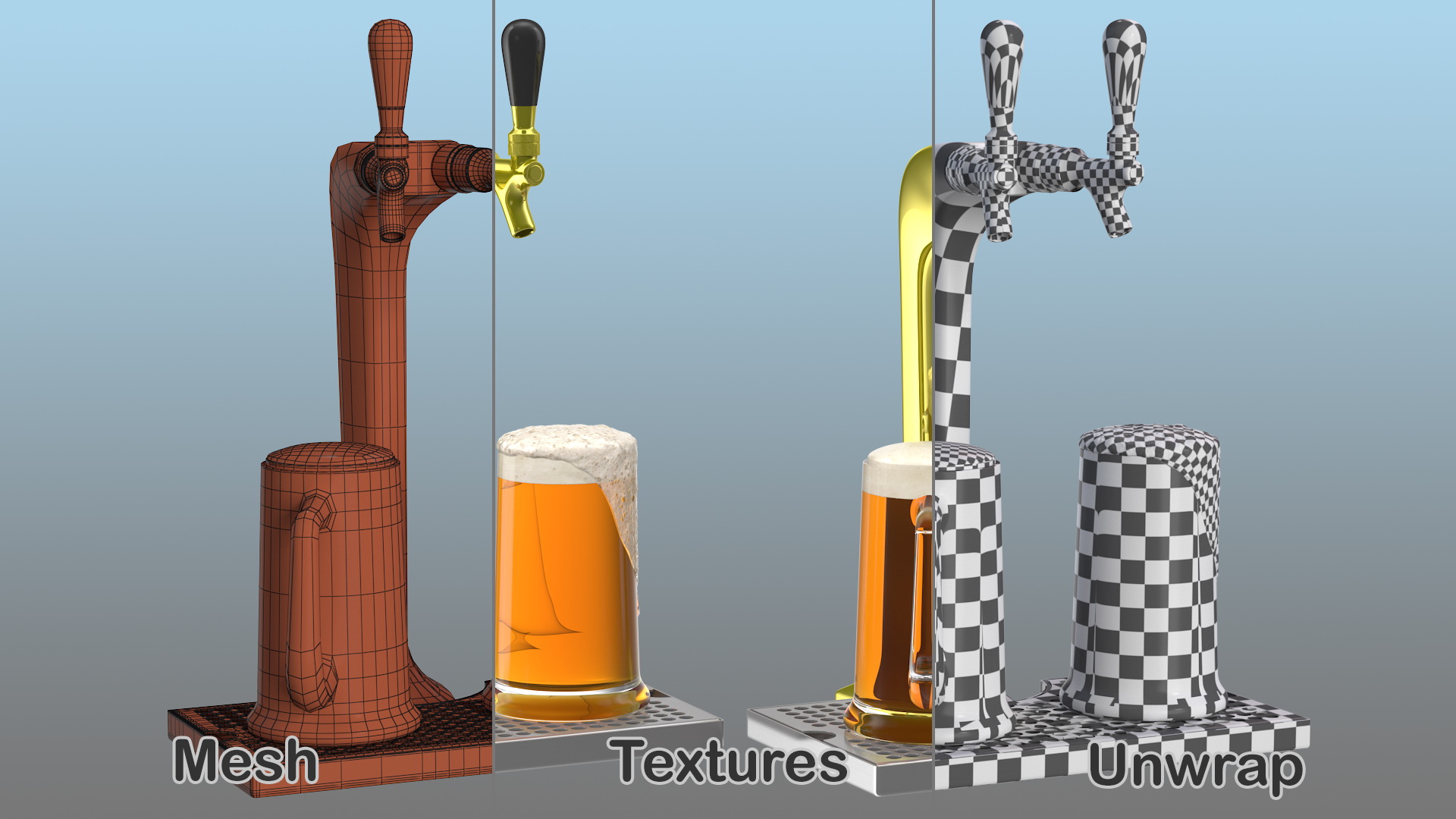 Double Tap Brass Draft Beer Tower with Beer Mugs is a high quality, photo real 3d model that will enhance detail and realism to any of your rendering projects. The model has a fully textured, detailed design that allows for close-up renders, and was originally modeled in 3ds Max 2020 and rendered with V-Ray. Renders have no postprocessing!