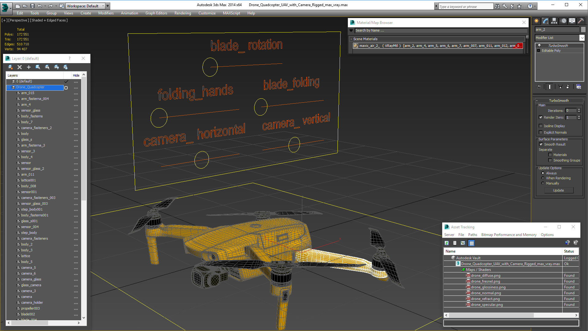 Drone Quadcopter UAV with Camera Rigged is fully rigged and is ready to be animated. You can easily position it the way you need or animate it the way your project requires using helpers in 3D Studio Max. See the turntable to get an idea of how rigging works.