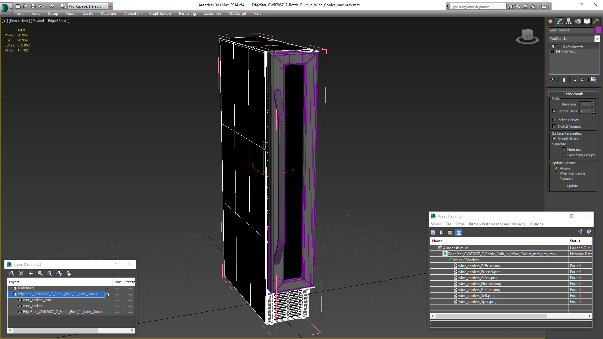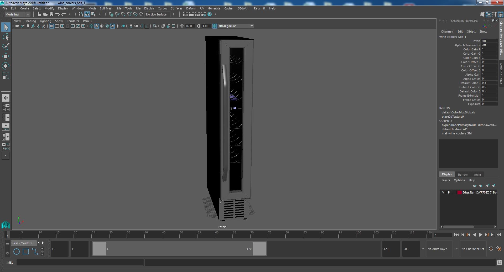 EdgeStar CWR70SZ 7 Bottle Built In Wine Cooler is a high quality, photo real 3d model that will enhance detail and realism to any of your rendering projects. The model has a fully textured, detailed design that allows for close-up renders, and was originally modeled in 3ds Max 2020 and rendered with V-Ray. Renders have no postprocessing!