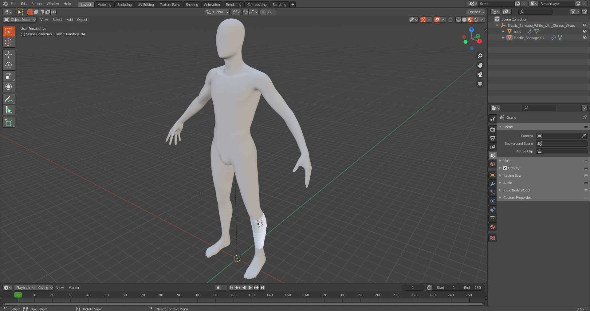 Elastic Bandage White with Clamps Wrapped Around Leg on Mannequin is a high quality, photo real 3d model that will enhance detail and realism to any of your rendering projects. The model has a fully textured, detailed design that allows for close-up renders, and was originally modeled in 3ds Max 2020 and rendered with V-Ray. Renders have no postprocessing!