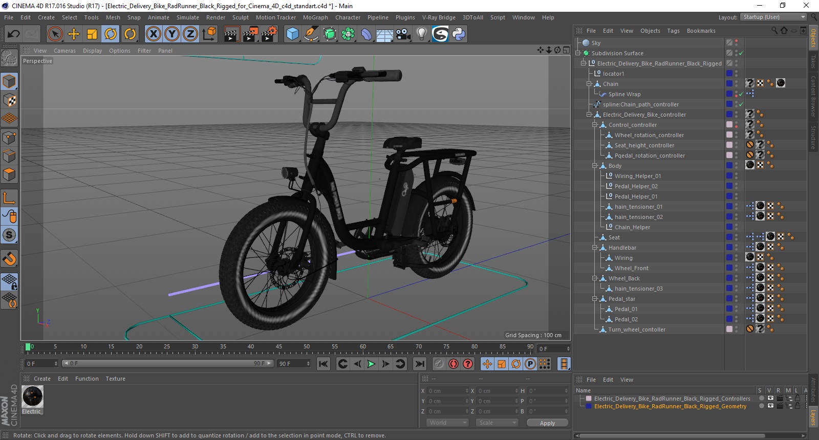 Electric Delivery Bike RadRunner Black Rigged for Cinema 4D is fully rigged and is ready to be animated in Cinema 4D. You can easily position it the way you need or animate it the way your project requires. See the screenshots to get an idea of how rigging works. The pose of the model on the render images is an example and can be recreated using rig, it is not initially included into the product.