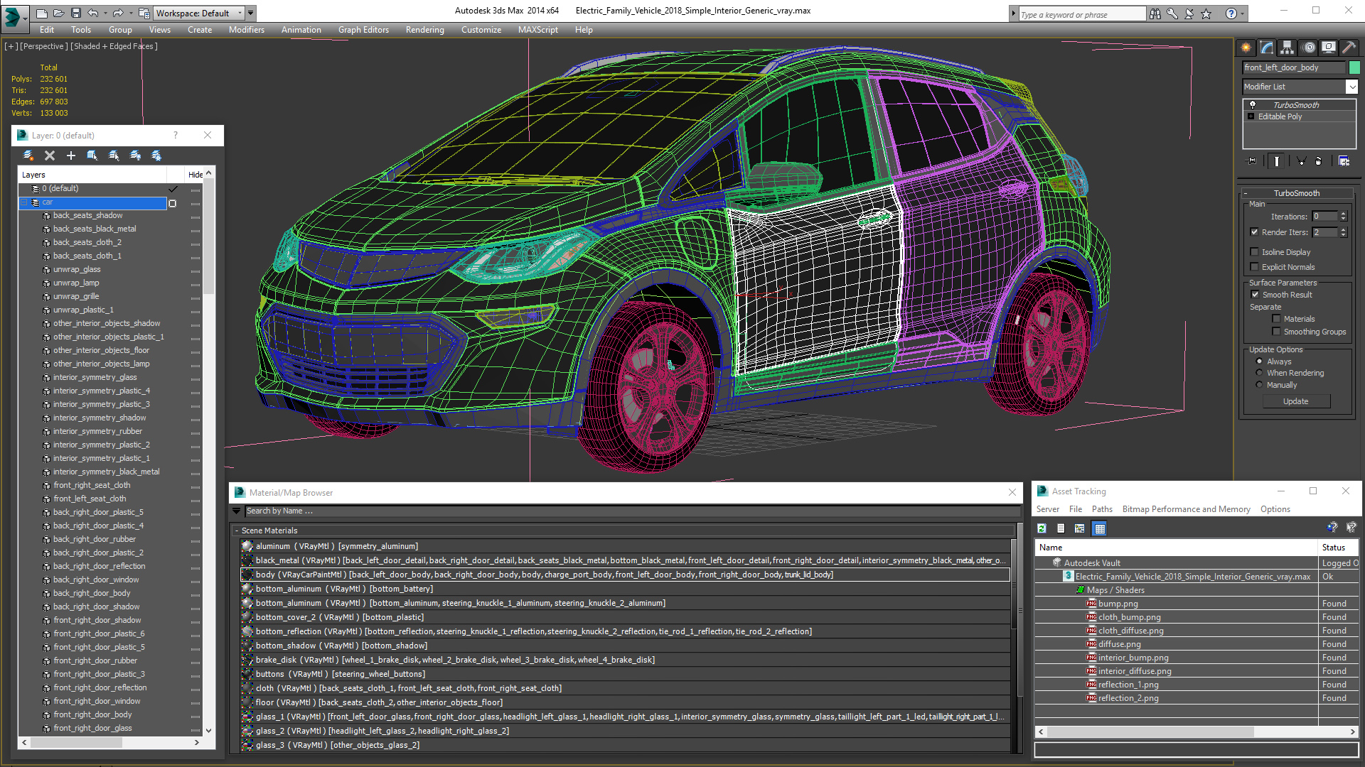 Electric Family Vehicle 2018 Simple Interior Generic is a high quality, photo real 3d model that will enhance detail and realism to any of your rendering projects. The model has a fully textured, detailed design that allows for close-up renders, and was originally modeled in 3ds Max 2020 and rendered with V-Ray. Renders have no postprocessing!