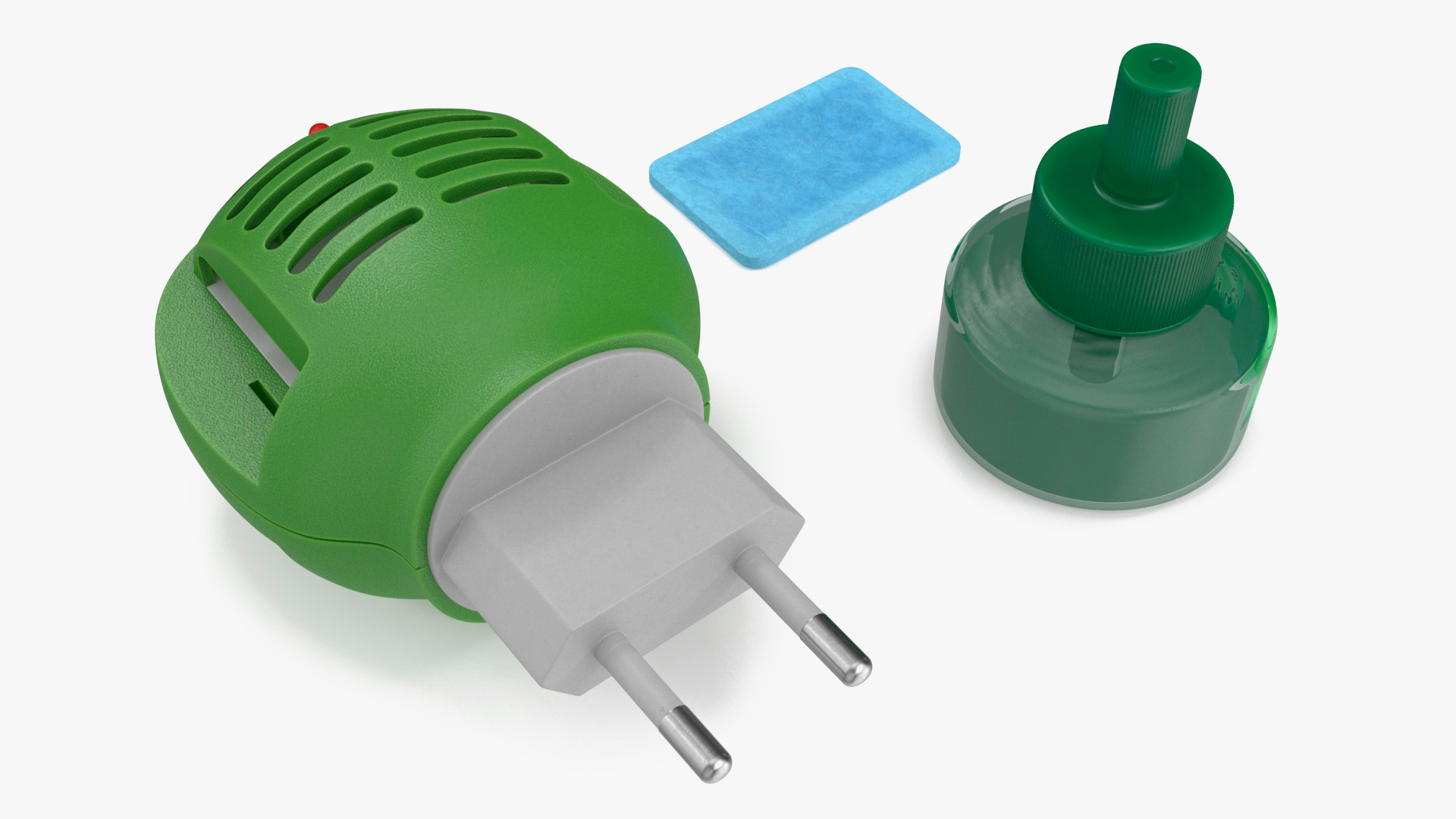 Electric Mosquito Repellent Set Green Disassembled is a three-dimensional model of chemical control type tool which used to pest bite prevention, and which is a specialized electrical device used to plug into a wall mounted electrical outlet.