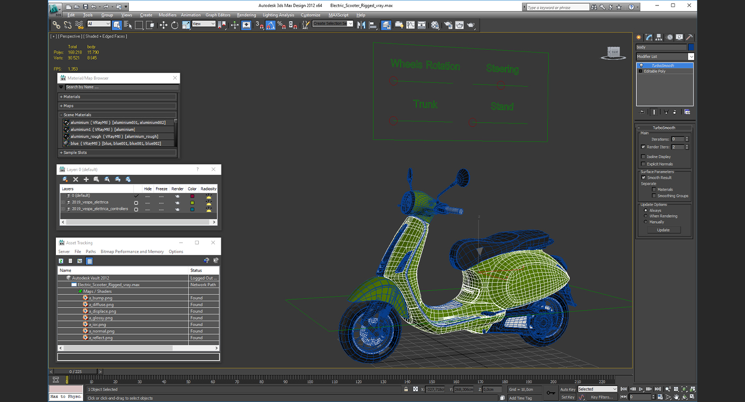 Electric Scooter Rigged is fully rigged and is ready to be animated. You can easily position it the way you need or animate it the way your project requires using helpers in 3D Studio Max. See the turntable to get an idea of how rigging works.