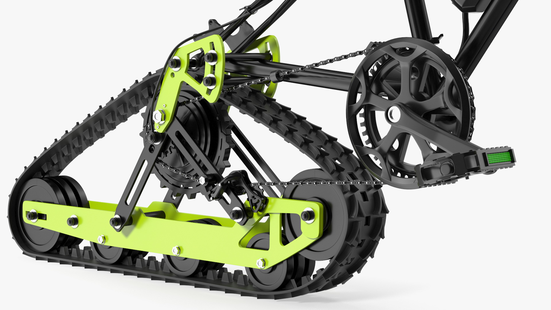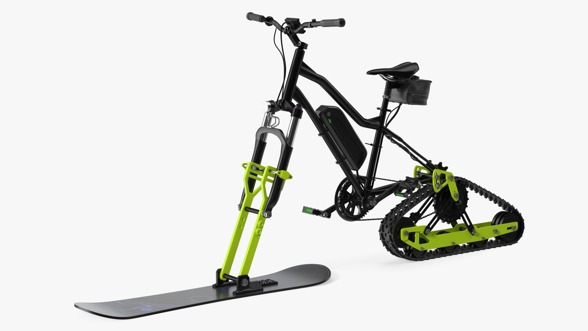 Electric SnowBike Rigged is a three-dimensional model of a snow racing, tracked vehicle which is winter snow mobile machine with caterpillar track propelling and sliding ski feature.