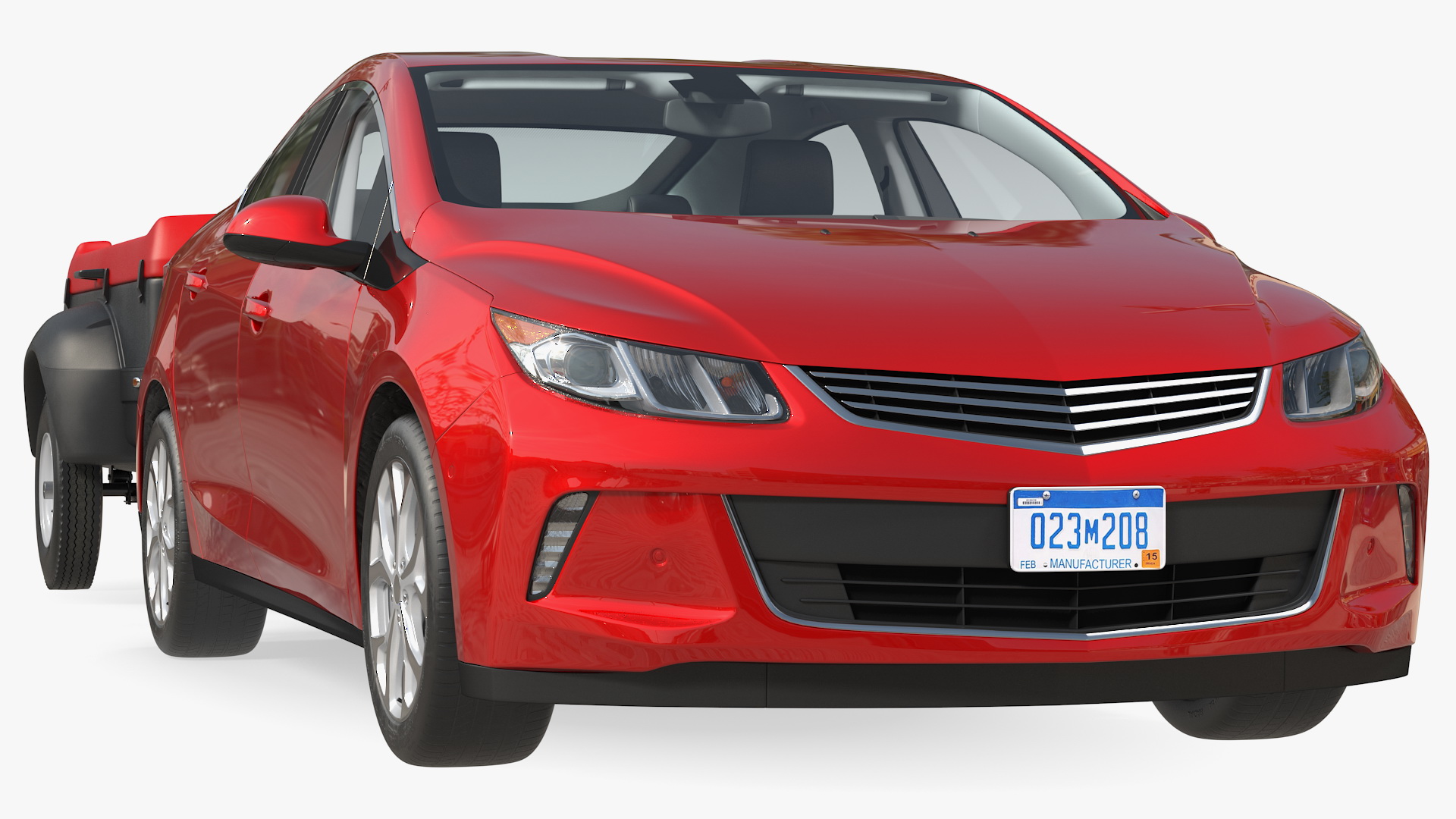 Mini cargo utility trailer cargo transporting vehicle that is towed by red hatchback car.