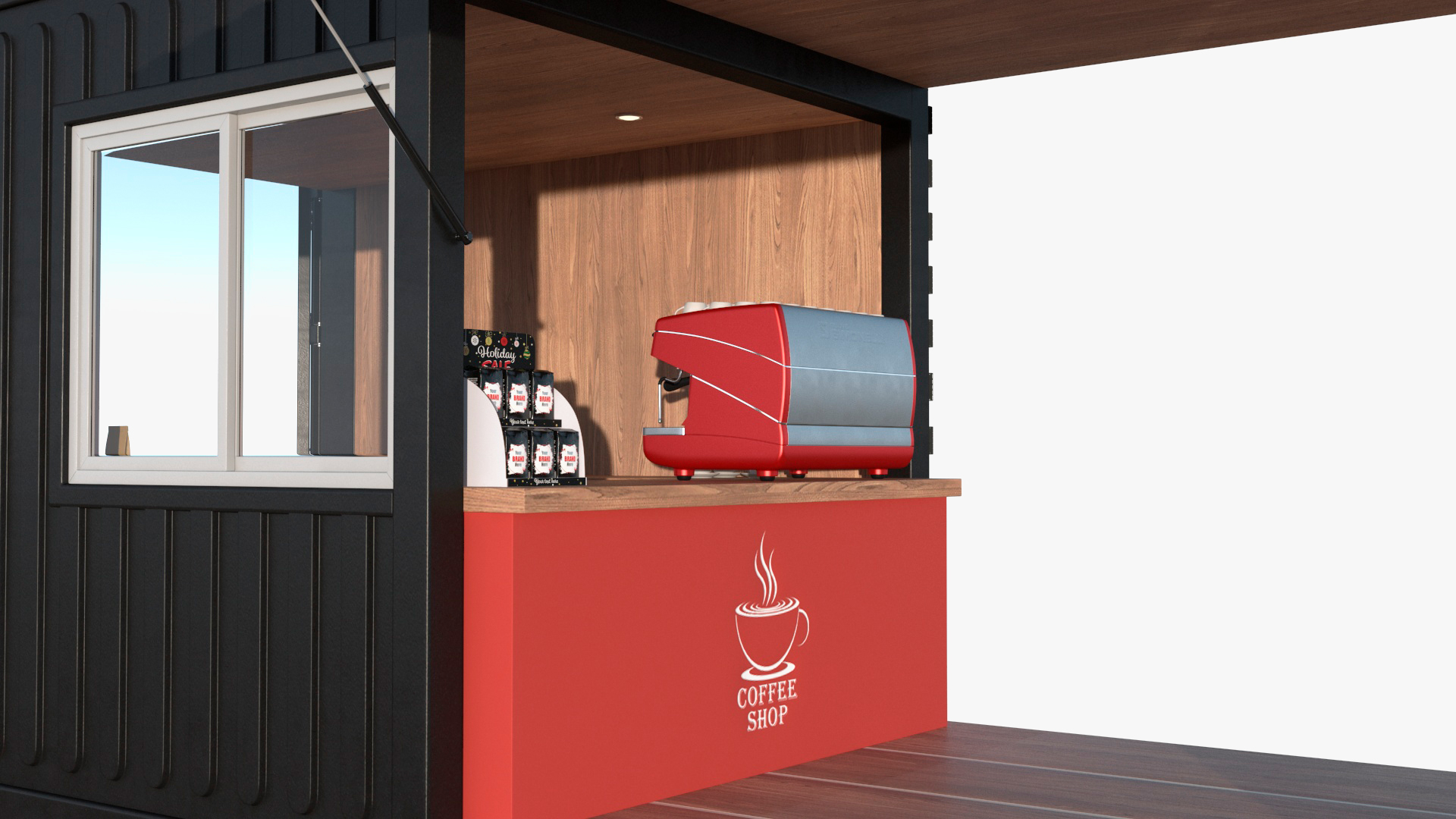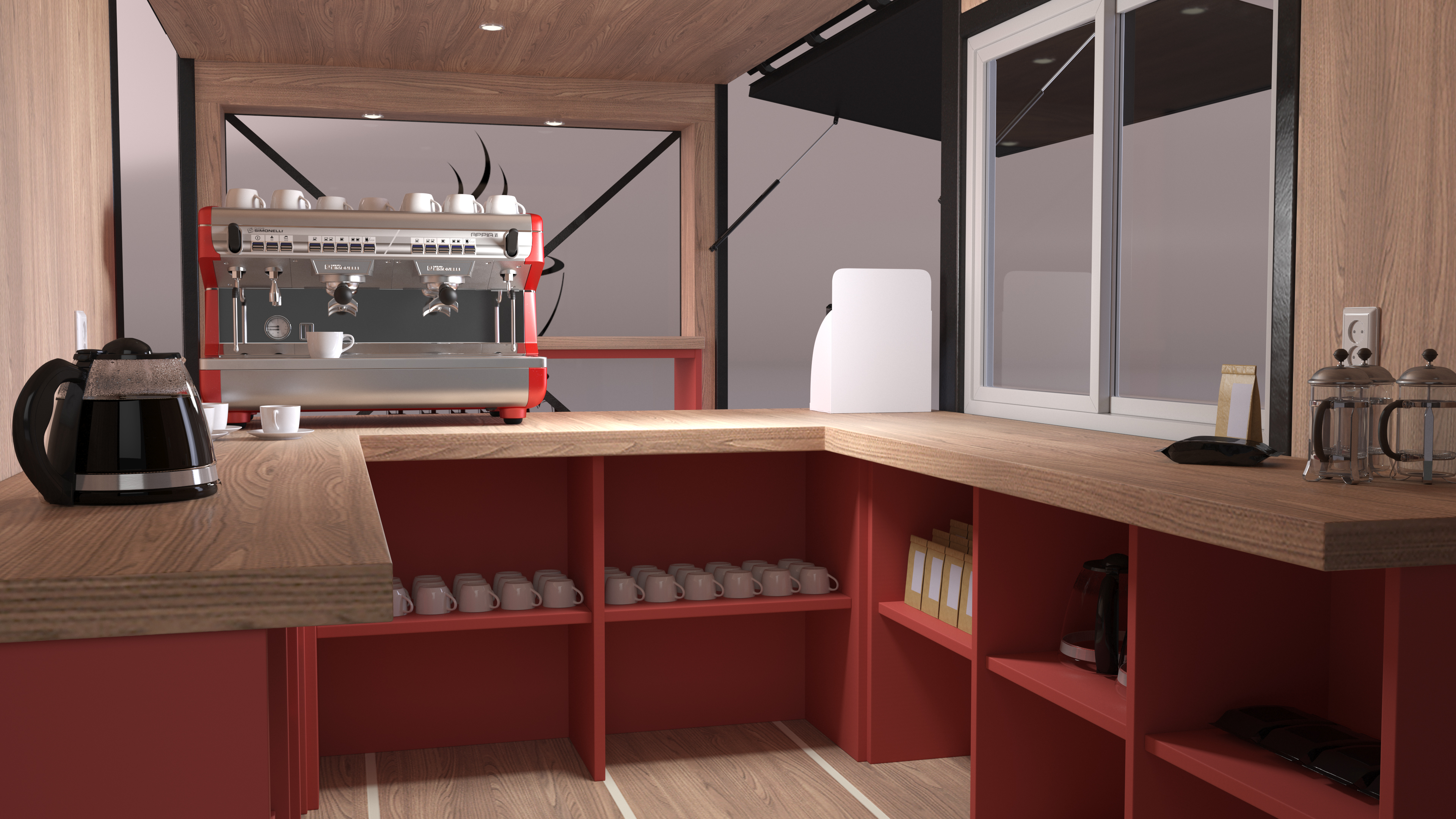 Equipped Container Coffee Shop is a 3d model of portable coffee shop that is built inside a shipping container and is fully equipped with all the necessary appliances and fixtures to serve coffee and other beverages.