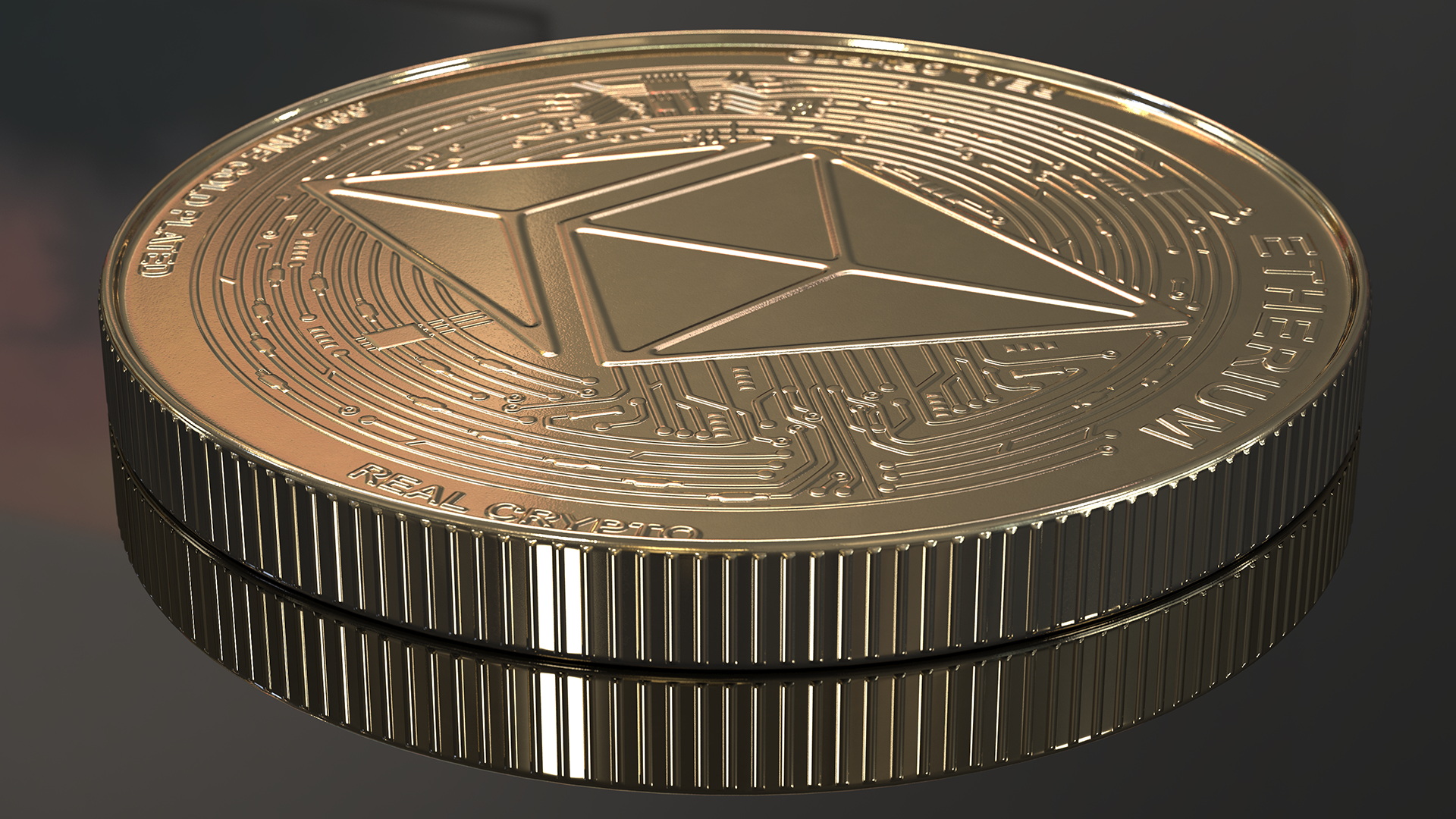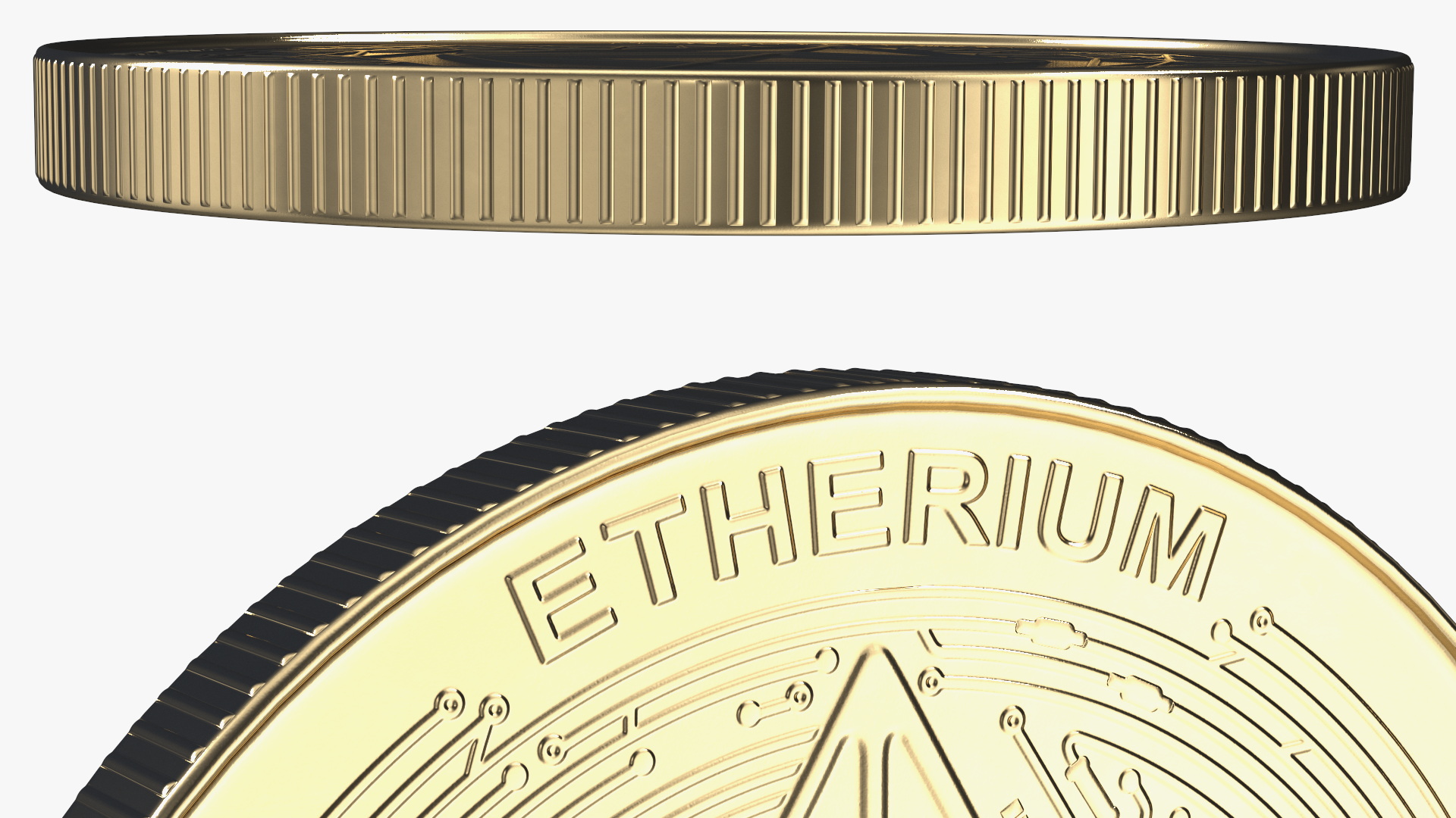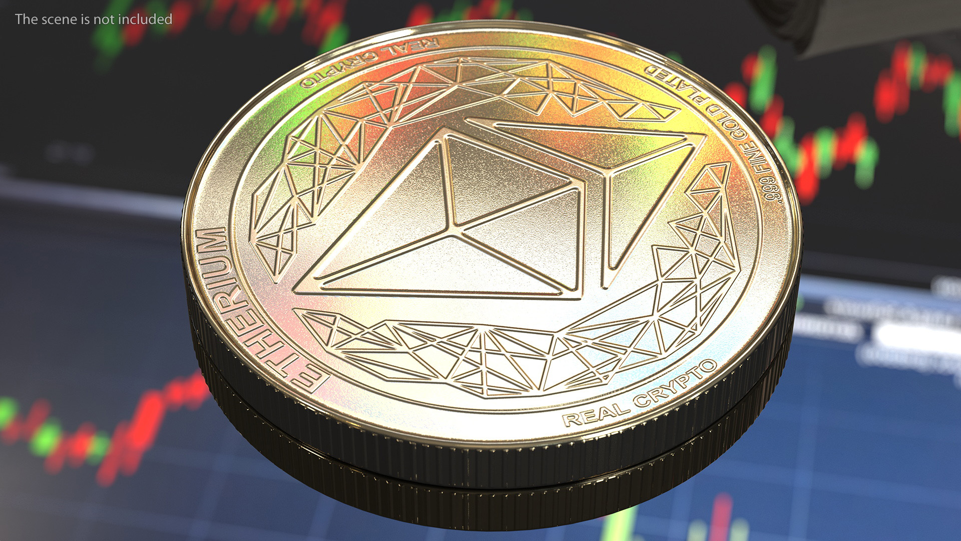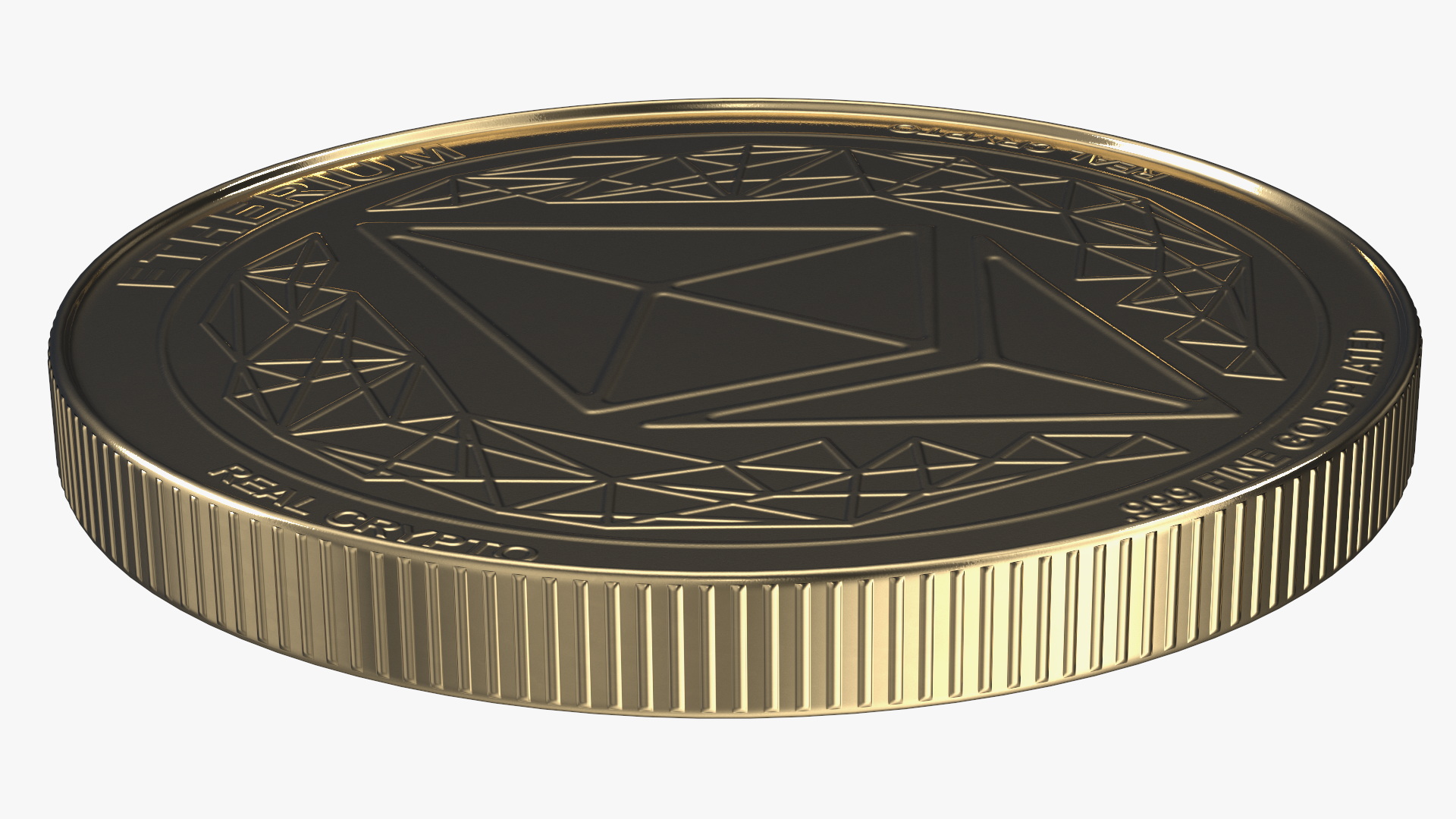 Ethereum ETH Cryptocurrency Golden Coin a component of the decentralized, open-source blockchain featuring smart contract functionality.