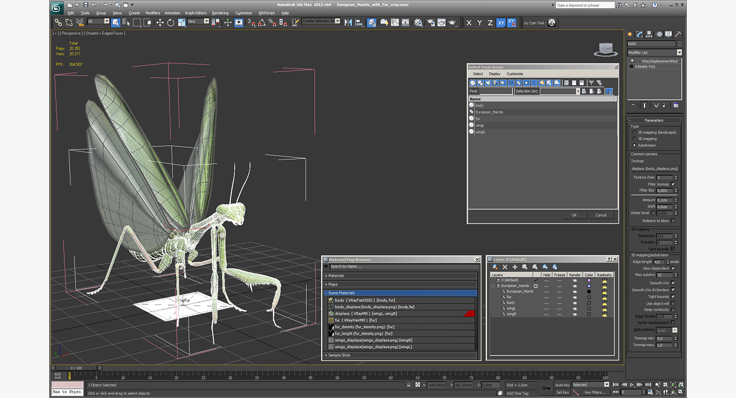 European Mantis with Fur has a 3dsmax Fur modifier, hair customizable (hair count, hair segments, hair color, root size, tip size, etc).
