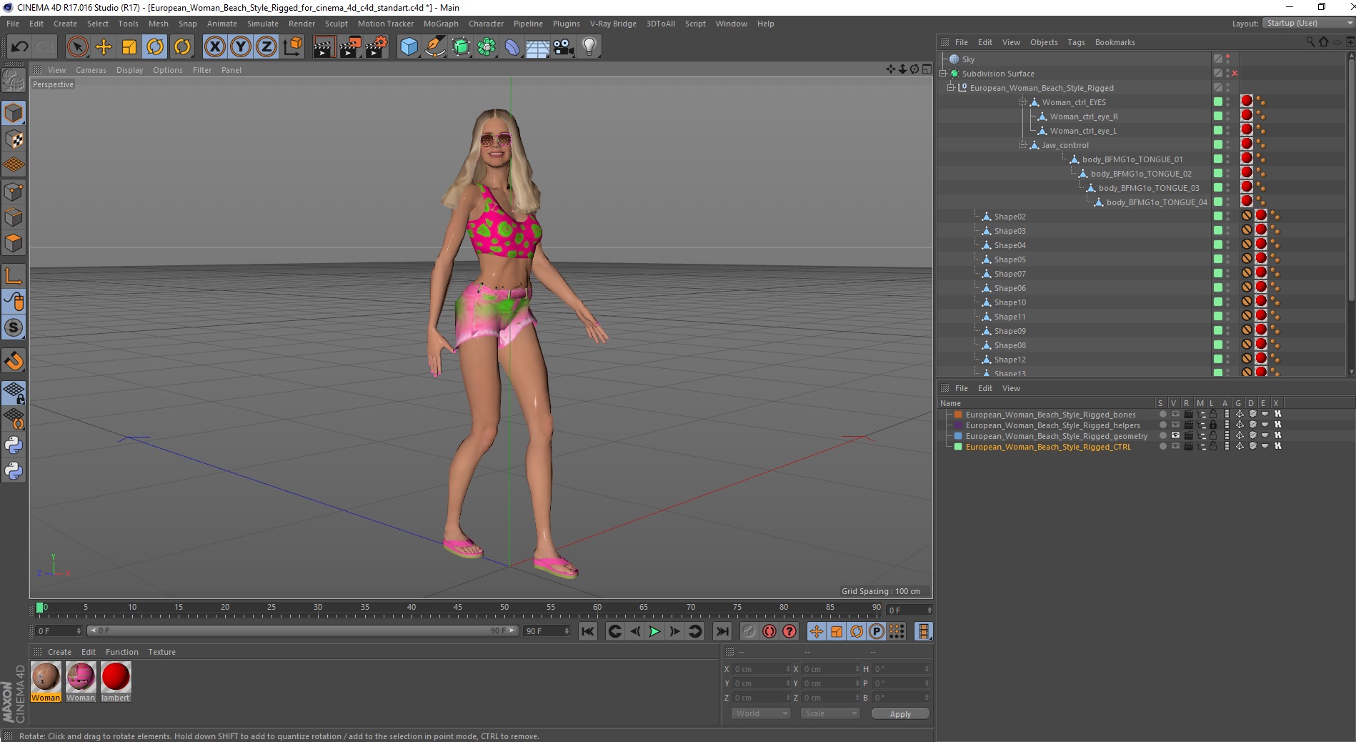 European Woman Beach Style Rigged for Cinema 4D is fully rigged and is ready to be animated in Cinema 4D. You can easily position it the way you need or animate it the way your project requires. See the screenshots to get an idea of how rigging works. The pose of the model on the render images is an example and can be recreated using rig, it is not initially included into the product.