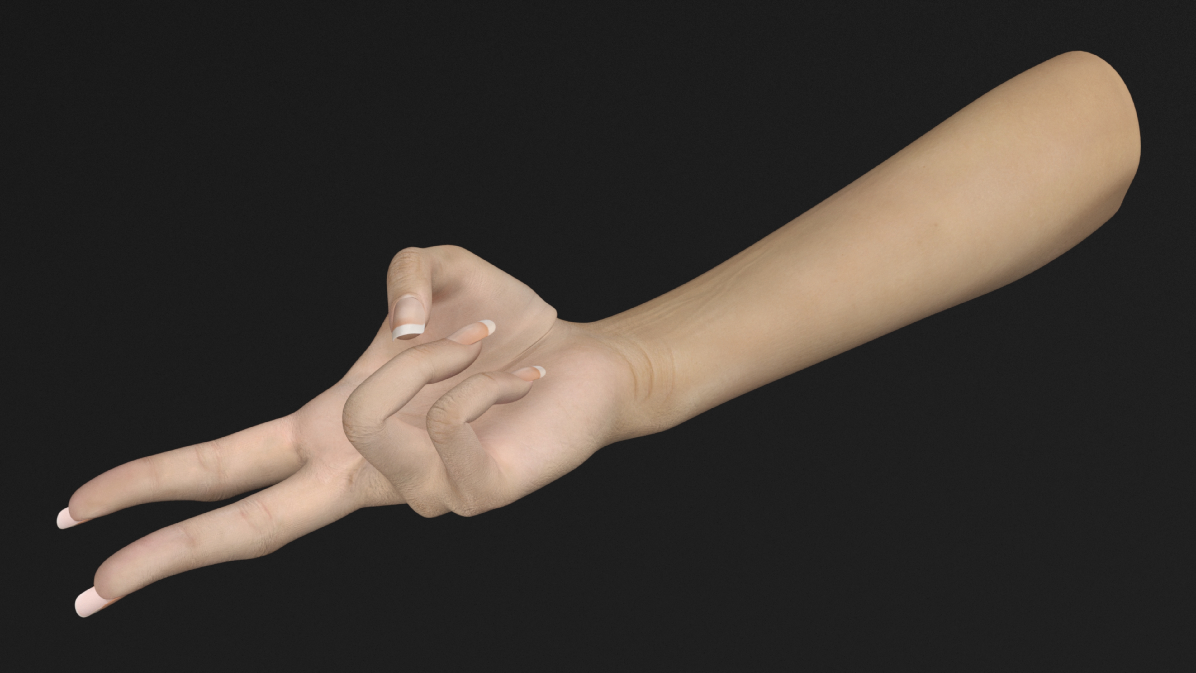 European Woman Hand Victory Sign Pose is a three-dimensional model of caucasian type woman (white) person hand or arm, which is a depicture of white female character arm with nails, muscles, and skin.