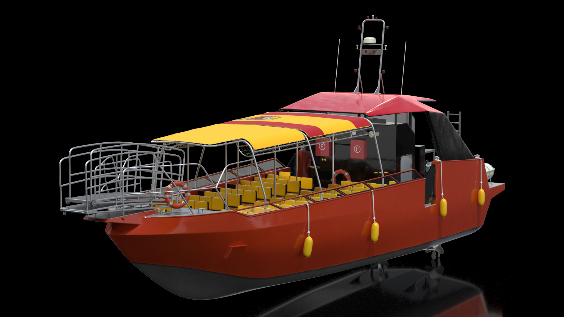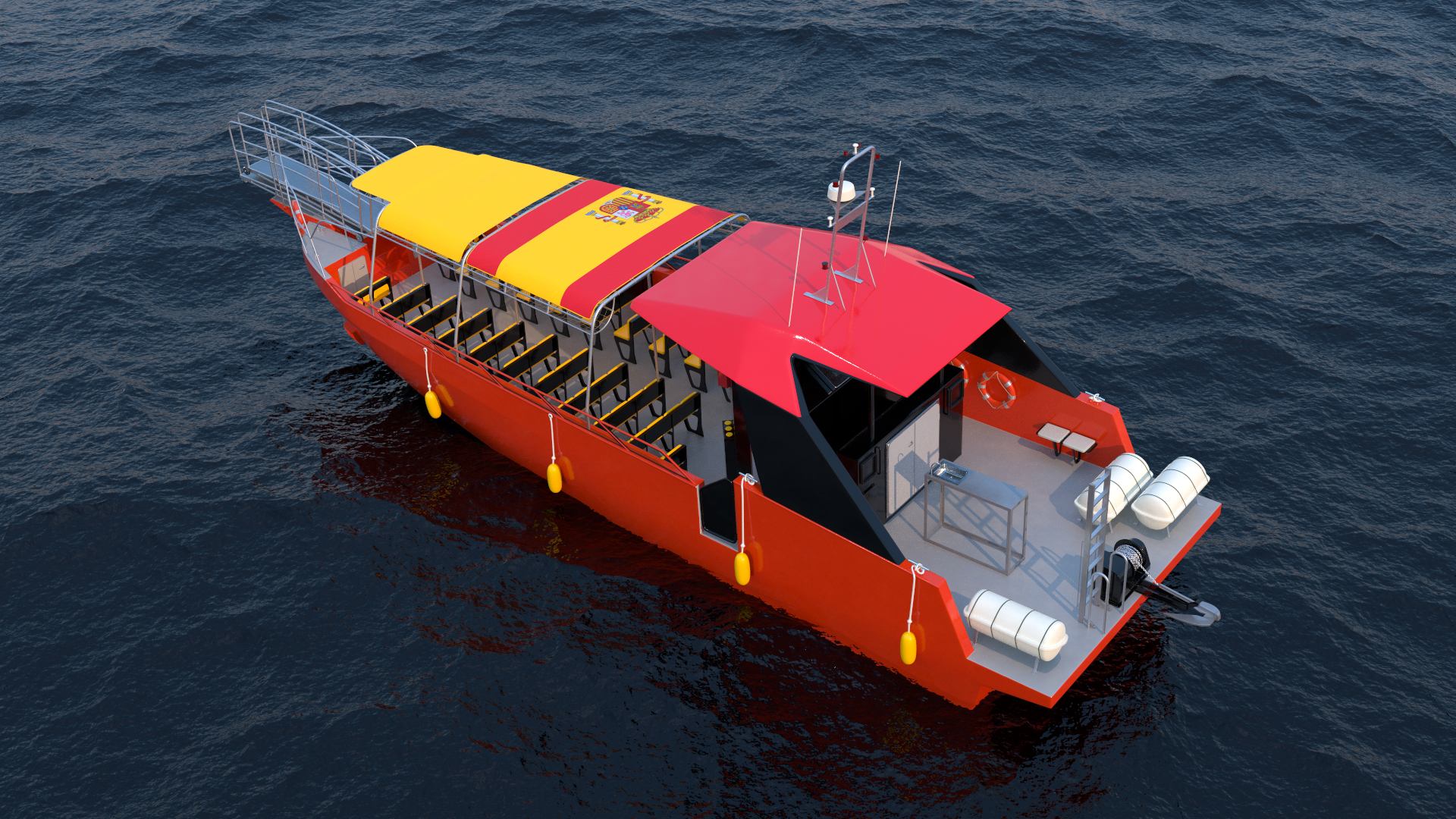 Excursion Boat Black Red is a high quality, photo real 3d model that will enhance detail and realism to any of your rendering projects. The model has a fully textured, detailed design that allows for close-up renders, and was originally modeled in 3ds Max 2020 and rendered with V-Ray. Renders have no postprocessing!