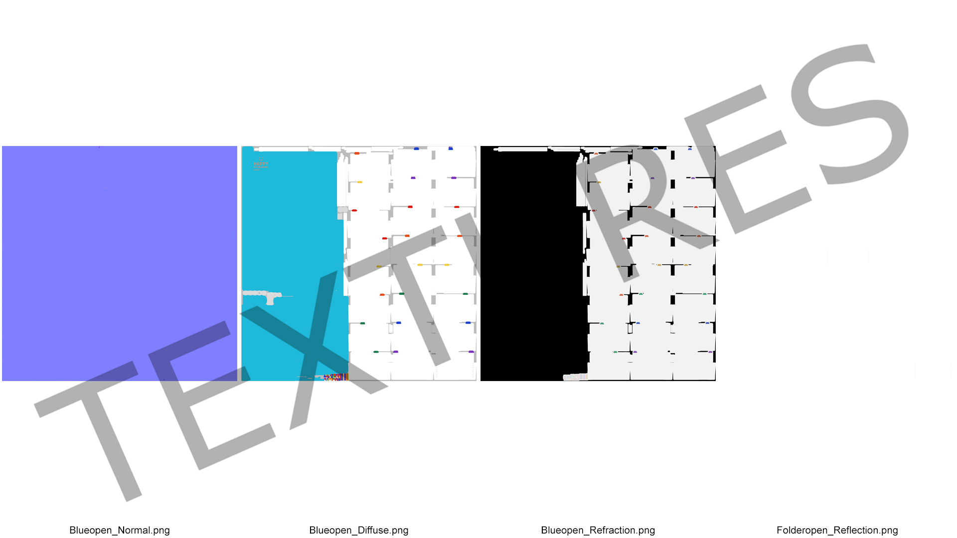All textures and materials are included and mapped. (All colors can be easily modified.)