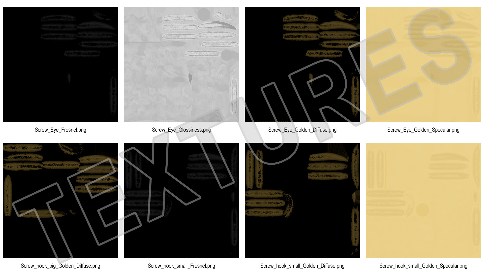 Eye Screw Hooks Set Gold is a high quality, photo real 3d model that will enhance detail and realism to any of your rendering projects. The model has a fully textured, detailed design that allows for close-up renders, and was originally modeled in 3ds Max 2020 and rendered with V-Ray. Renders have no postprocessing!