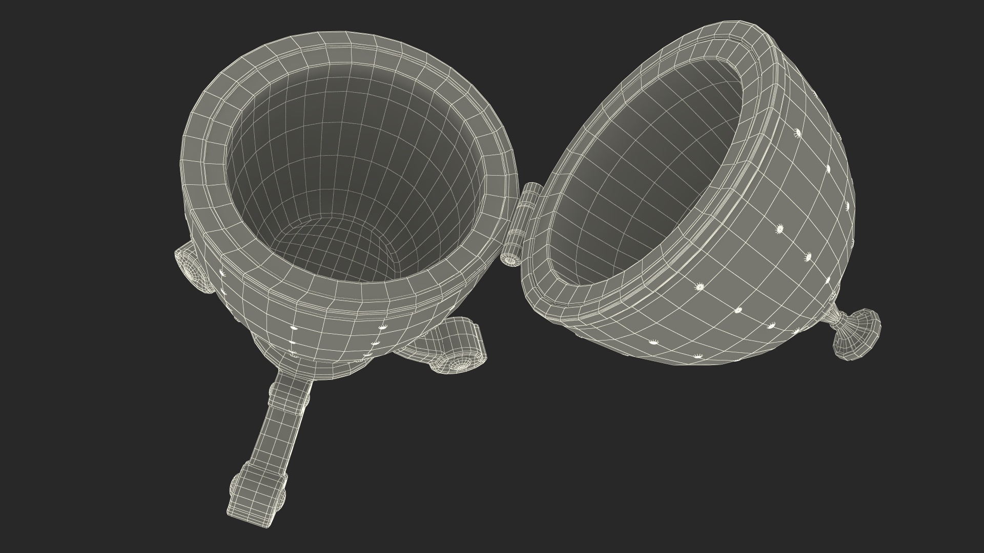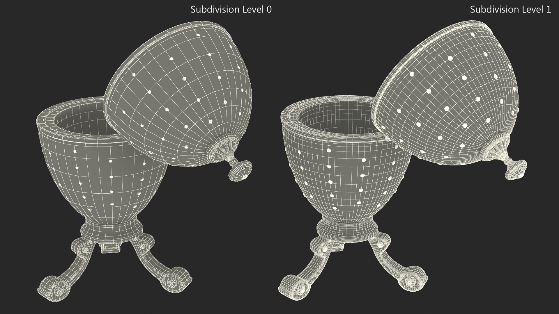 Faberge Golden Egg Open is a 3D model of piece of jewelry art which was used as jewel type, luxury Easter gift (Paschal present).