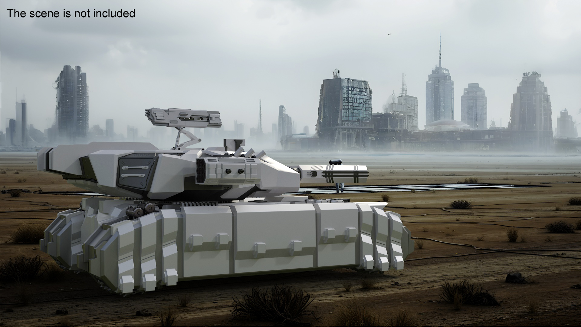 This model features a sleek, white exterior and is built to convey both strength and futuristic technology. The tank is characterized by its robust armor plating, a powerful main cannon, and integrated defensive systems. It includes a rotating turret, high-tech targeting equipment, and reinforced tracks for superior mobility in various terrains. The white finish not only gives it a striking appearance but also suits a range of high-tech and futuristic scenarios.