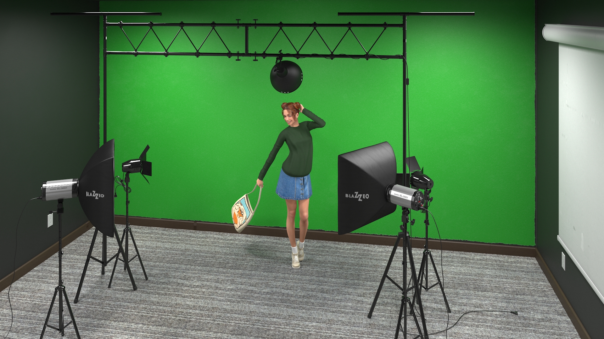 Female Character in Photo Studio Setup is a 3d model of a professional photography studio, featuring a posed female character designed to illustrate portrait or fashion photoshoots in a controlled studio environment.