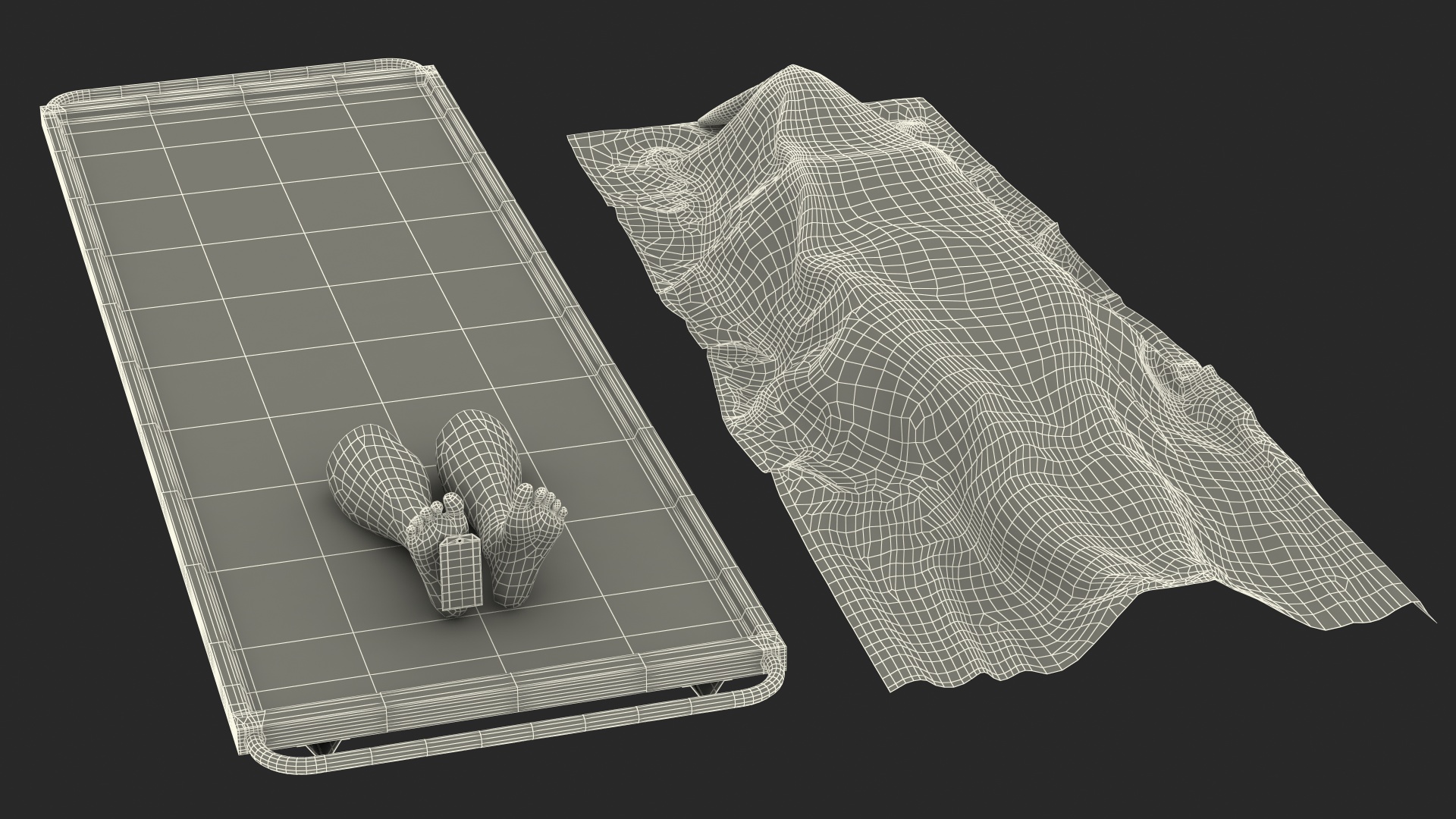 Female Dead Body Covered with Cloth is a three-dimensional model of lying human person corpse on a metallic tray with handles (metal stretcher), which covered with a white cloth (fabric sheet).
