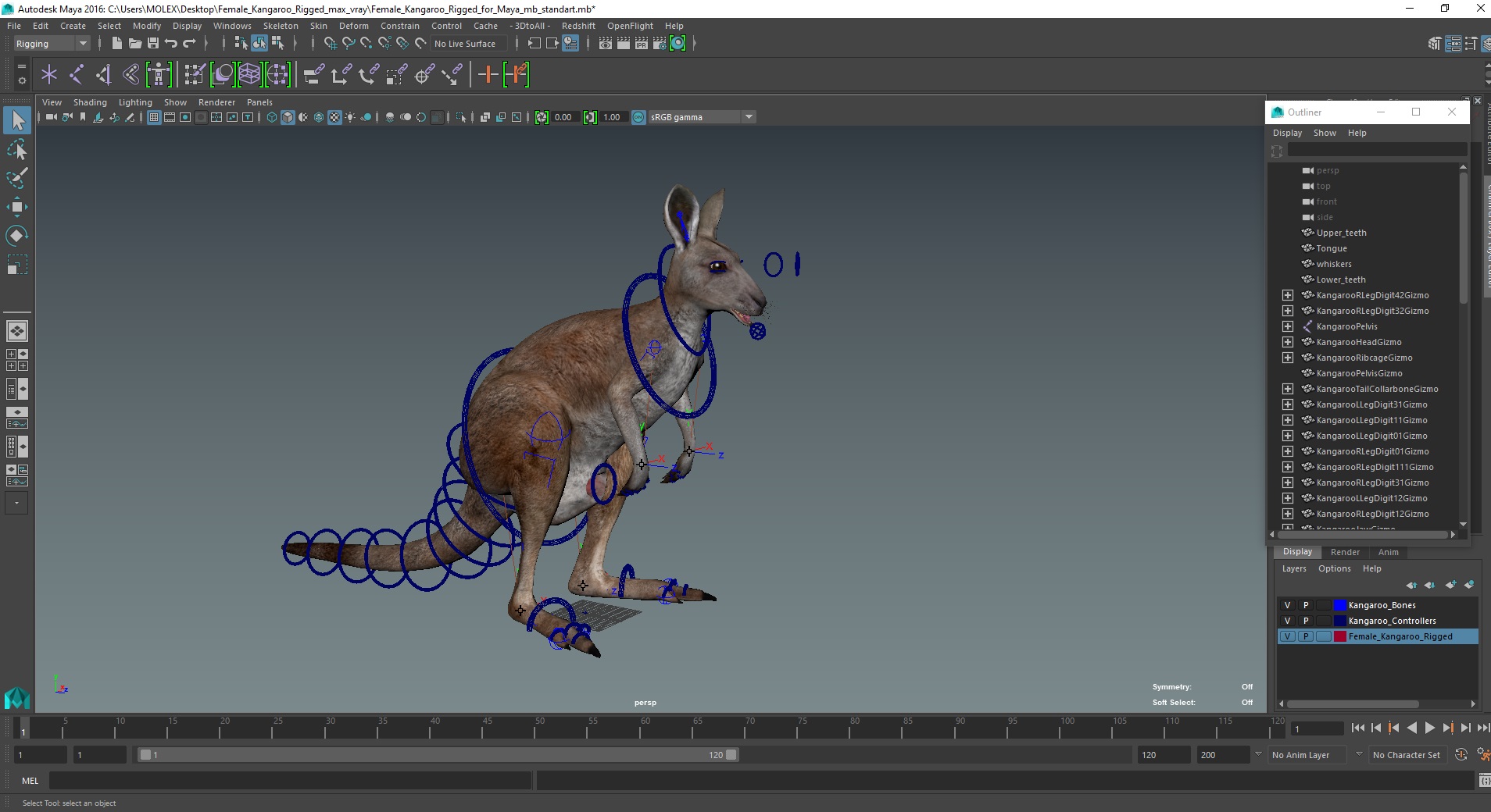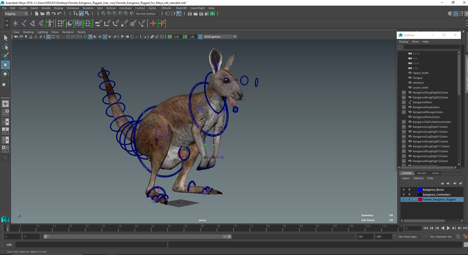 Female Kangaroo Rigged for Maya is fully rigged and is ready to be animated in Maya. You can easily position it the way you need or animate it the way your project requires. See the screenshots to get an idea of how rigging works. The pose of the model on the render images is an example and can be recreated using rig, it is not initially included into the product.