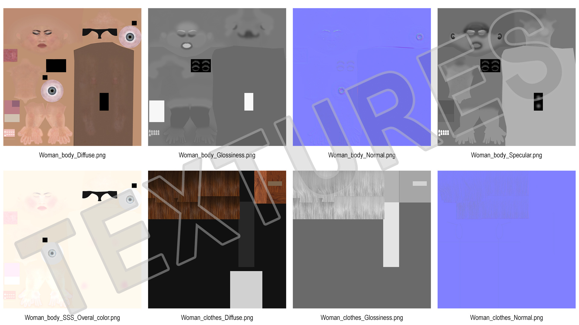 All textures and materials are included and mapped. (All colors can be easily modified.)