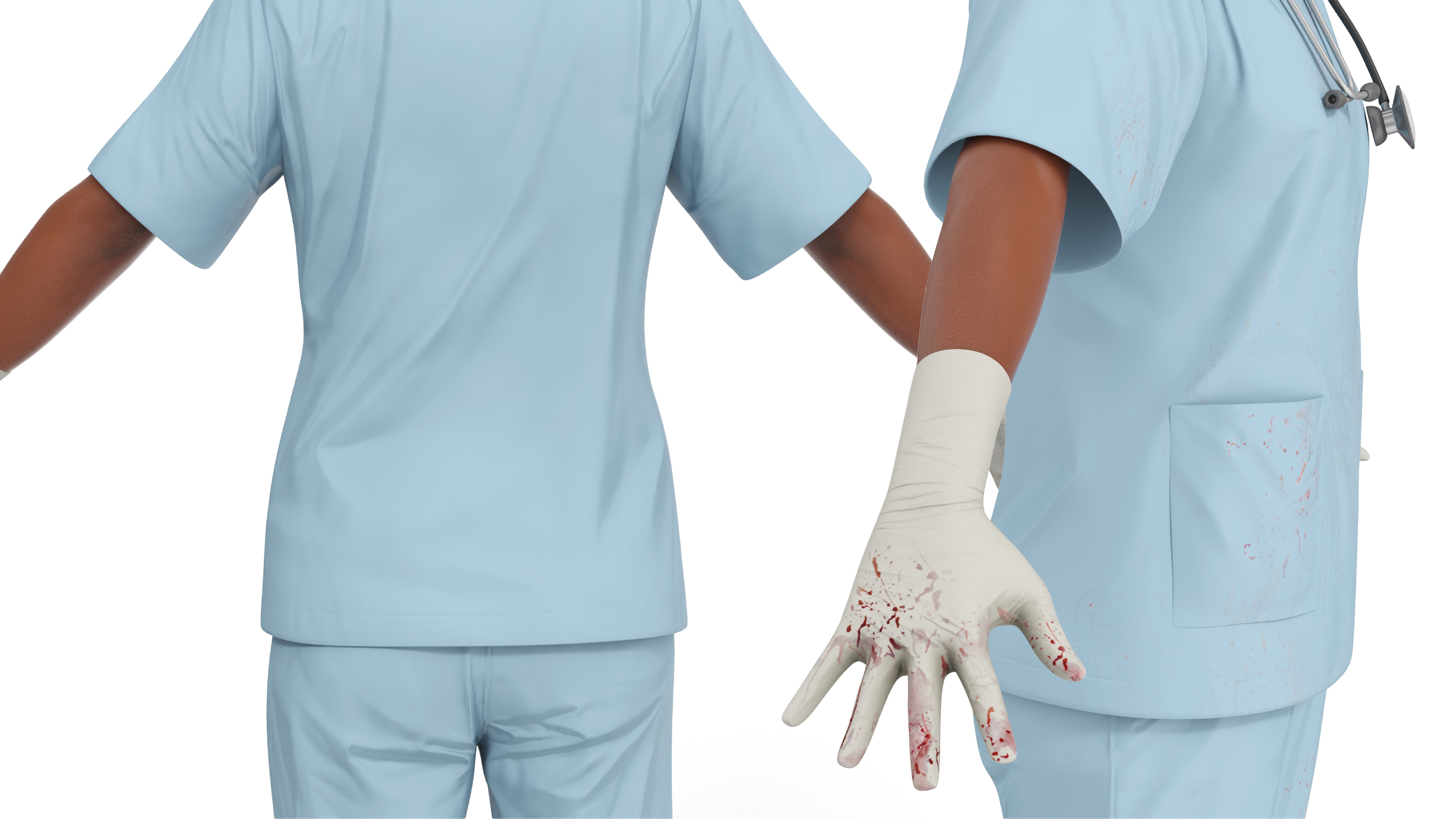 African-American brave women which is a hospital physician or medical worker in a blue surgical suit which is the antimicrobial wear. Women surgeon which is stained at the time after the procedure with blood stains. Afro-American, African-American, Afro American, Aframerican, Black or African American brave female surgeon character.