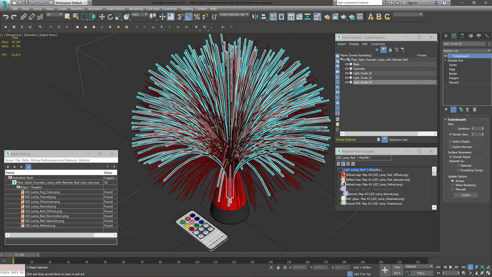 Fiber Optic Fountain Lamp with Remote Red is a high quality, photo real 3d model that will enhance detail and realism to any of your rendering projects. The model has a fully textured, detailed design that allows for close-up renders, and was originally modeled in 3ds Max 2020 and rendered with V-Ray. Renders have no postprocessing!