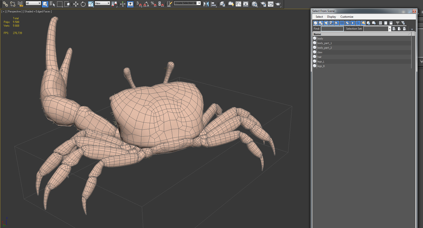 Fiddler Crab Fighting Pose with Fur has a 3dsmax Fur modifier, hair customizable (hair count, hair segments, hair color, root size, tip size, etc).