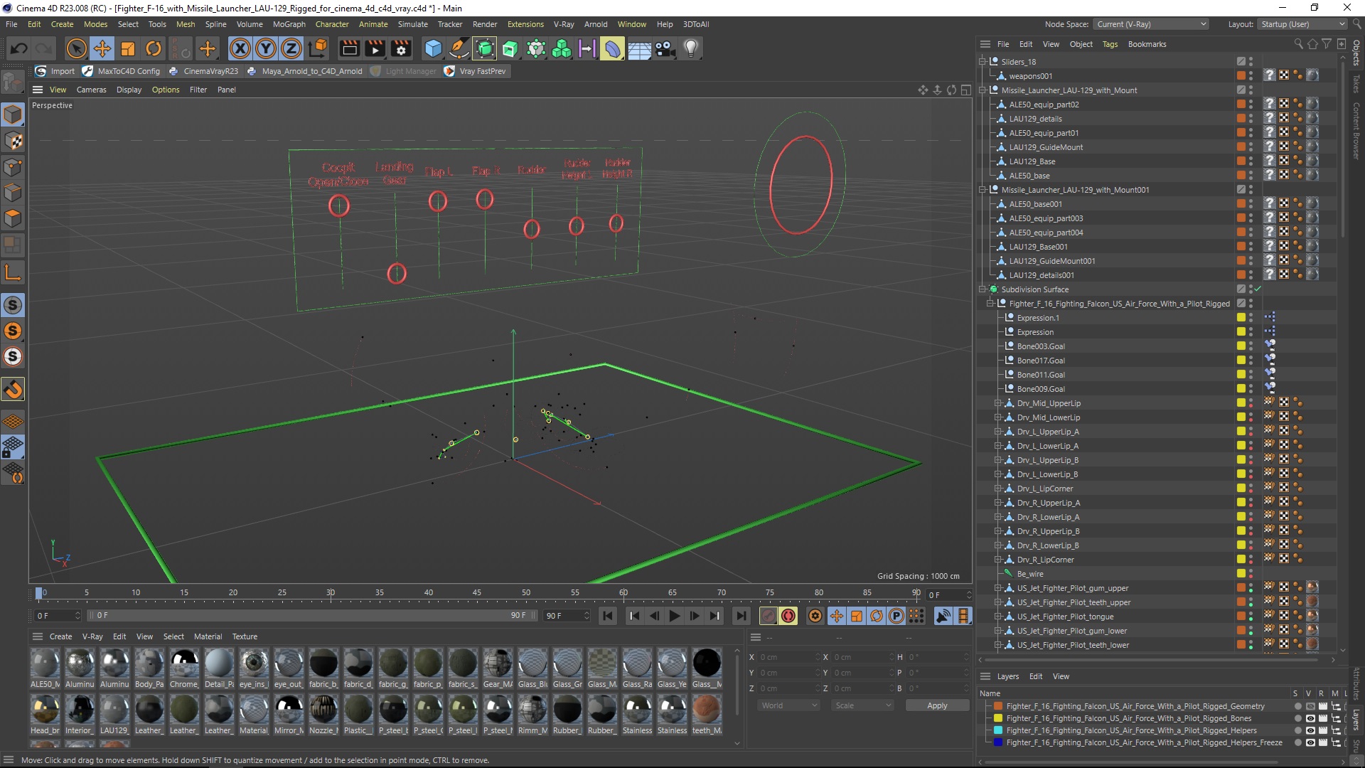 Fighter F-16 with Missile Launcher LAU-129 Rigged for Cinema 4D is fully rigged and is ready to be animated in Cinema 4D. You can easily position it the way you need or animate it the way your project requires. See the screenshots to get an idea of how rigging works. The pose of the model on the render images is an example and can be recreated using rig, it is not initially included into the product.