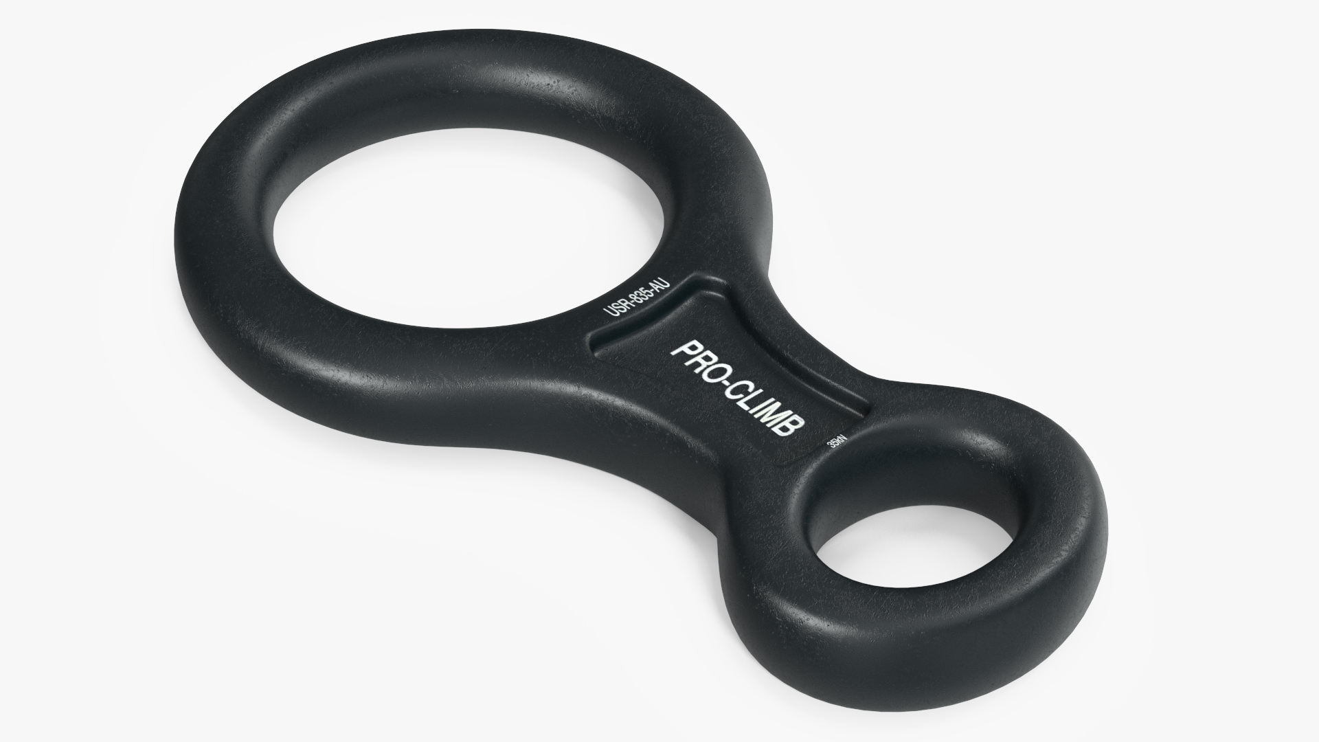 Figure of Eight Descender Pro-Climb Black is a three-dimensional model of figure 8 (eight) belay device which is a piece of metal in the shape of an 8 with one large end and one small end.