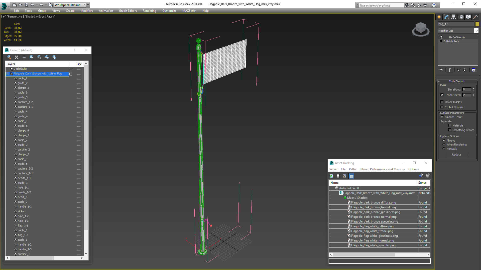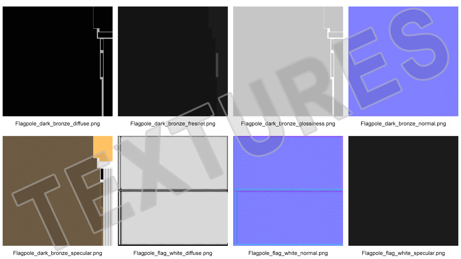 Flagpole Dark Bronze with White Flag is a high quality, photo real 3d model that will enhance detail and realism to any of your rendering projects. The model has a fully textured, detailed design that allows for close-up renders, and was originally modeled in 3ds Max 2020 and rendered with V-Ray. Renders have no postprocessing!