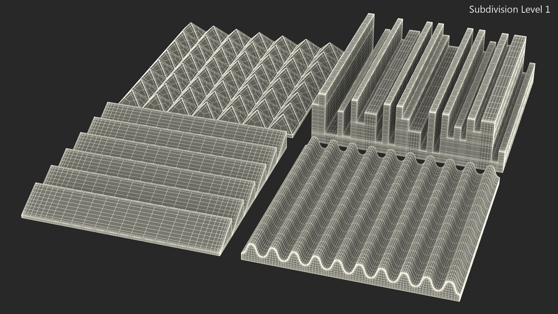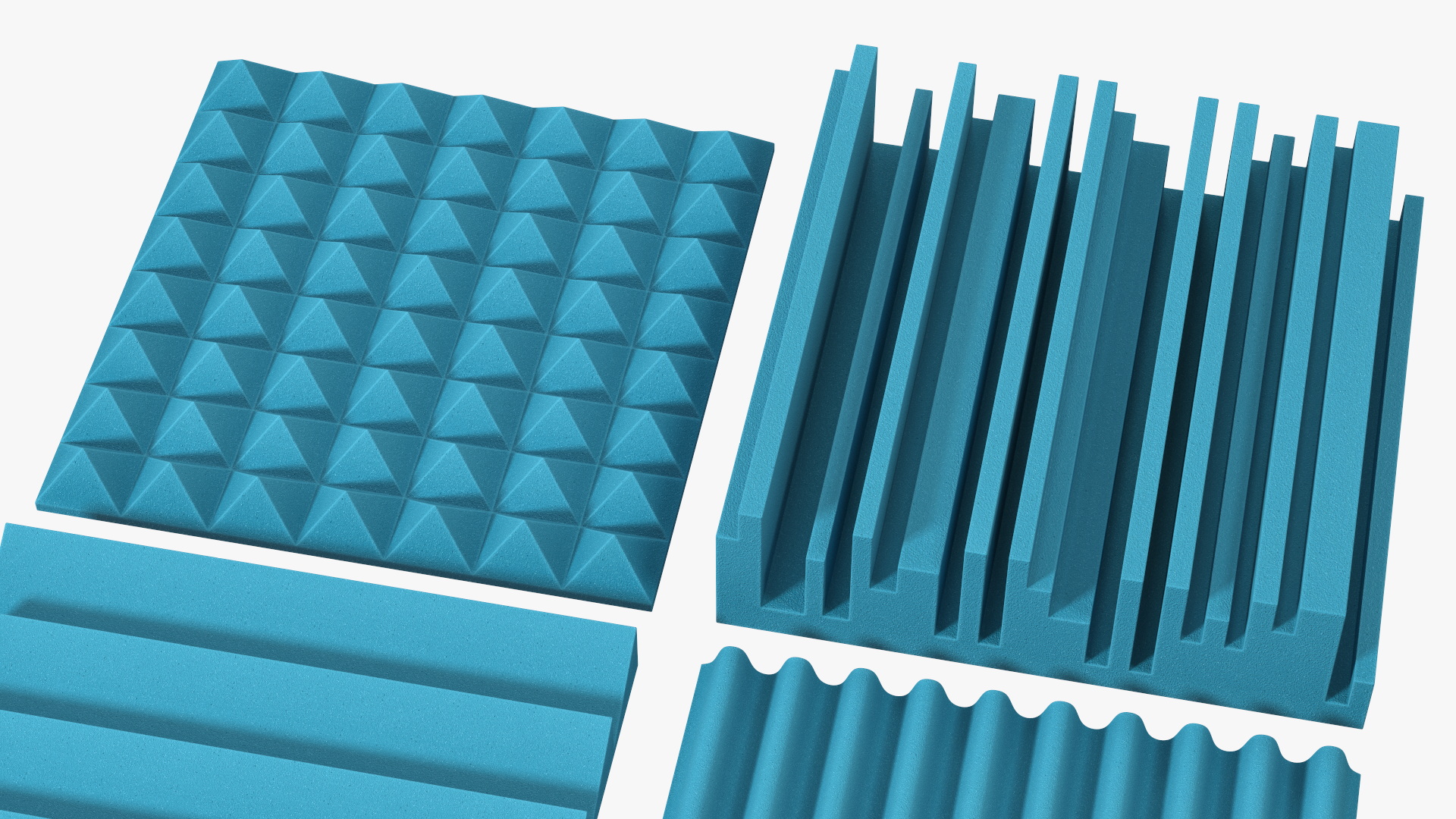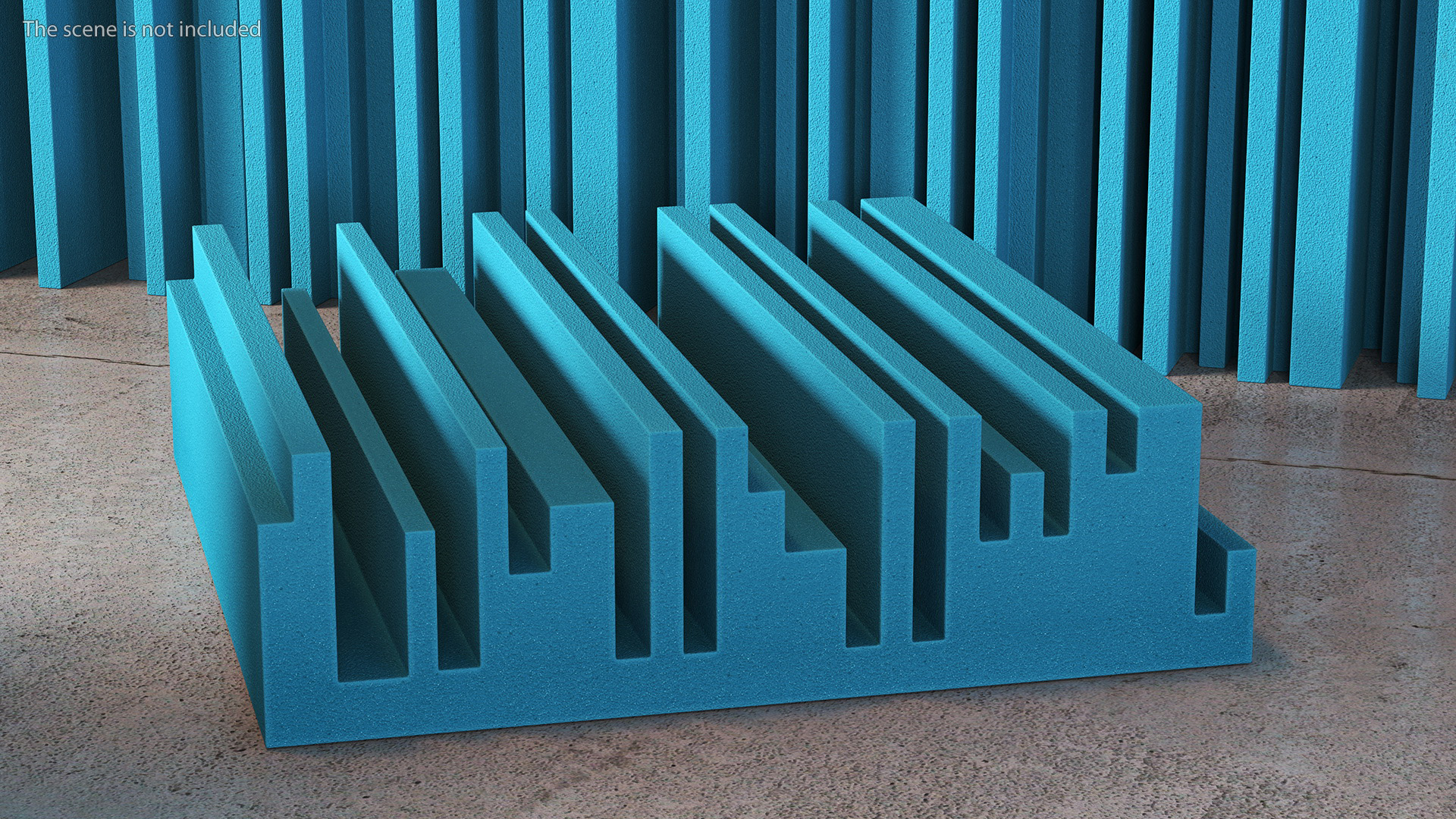 Foam Sound Absorbers Blue Set is a 3D model of collection of foam acoustic treatment panels, specifically designed sound proofing panels, or special sound insulation panels which are type of specific acoustic panel which is designed to absorb sound waves and reduce echoes, reverberation and unwanted noises in a room.