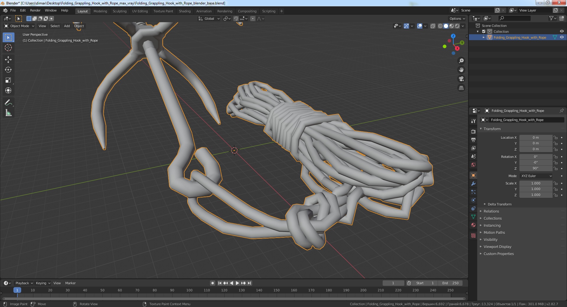Folding Grappling Hook with Rope is a high quality, photo real 3d model that will enhance detail and realism to any of your rendering projects. The model has a fully textured, detailed design that allows for close-up renders, and was originally modeled in 3ds Max 2020 and rendered with V-Ray. Renders have no postprocessing!