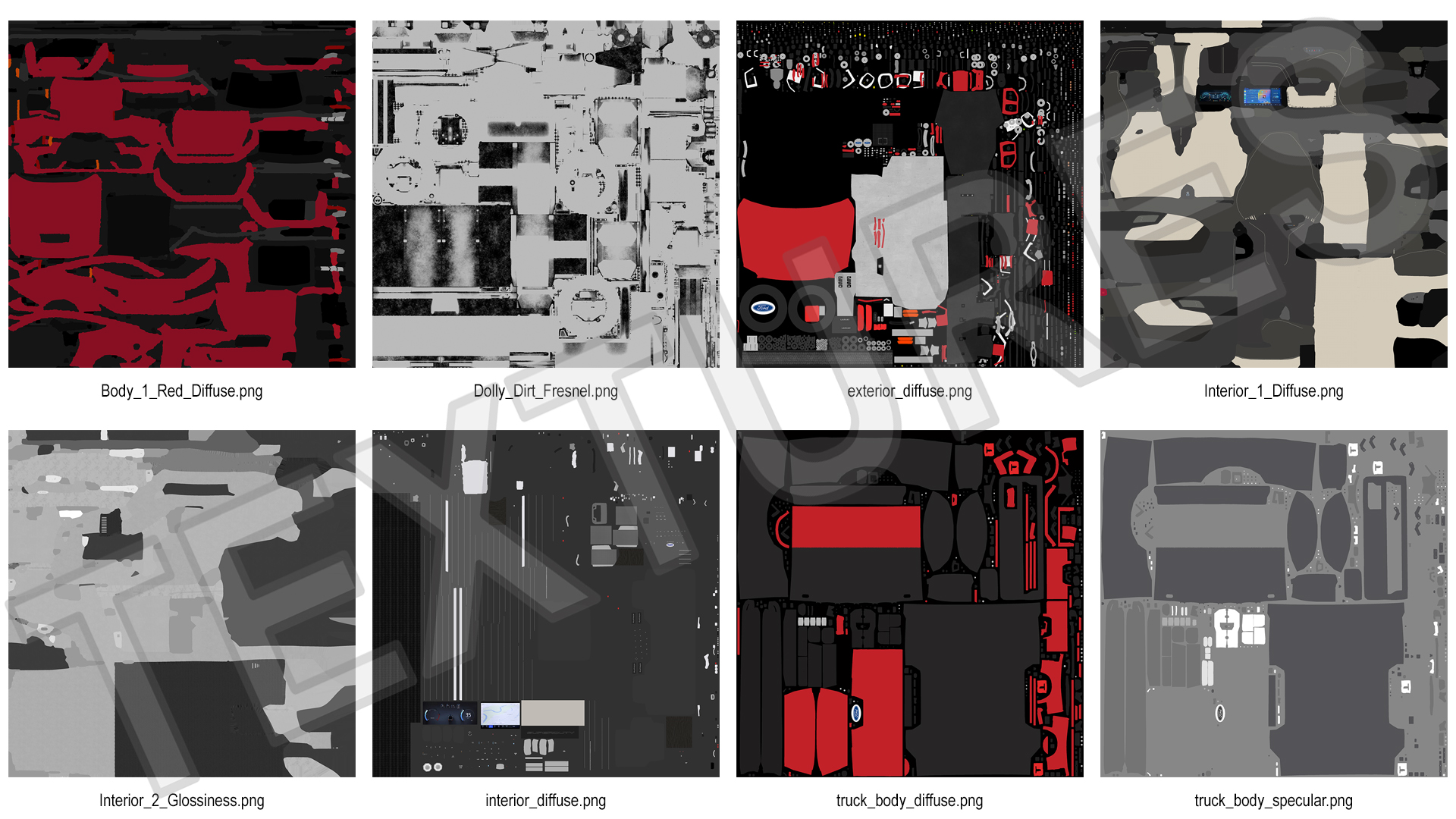 All textures and materials are included and mapped. (All colors can be easily modified.)