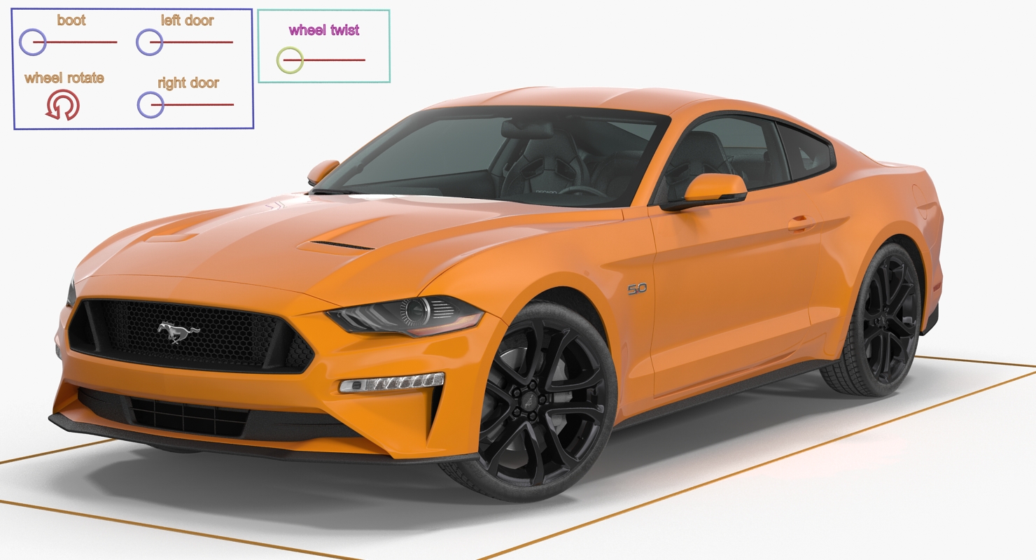Ford Mustang 2018 Rigged is fully rigged and is ready to be animated. You can easily position it the way you need or animate it the way your project requires using helpers in 3D Studio Max. See the turntable to get an idea of how rigging works.
